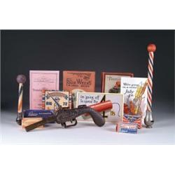 MISC. LOT OF CAP RELATED PIECES. Lot includes two cap shooting novelty books with seductive lasses on the covers, inviting the readers to a startling surprise. Titles include "Bachelor Girl" and "Four Week's--A Loud Book". Lot also includes cast iron folding "Bulldog" pistol bootjack, a variety of caps, and Independence Day postcards. SIZE: Books measure 6 3/4" h., bootjack 8 1/2" l. CONDITION: Overall near excellent. MC 1-4274 (300-500)