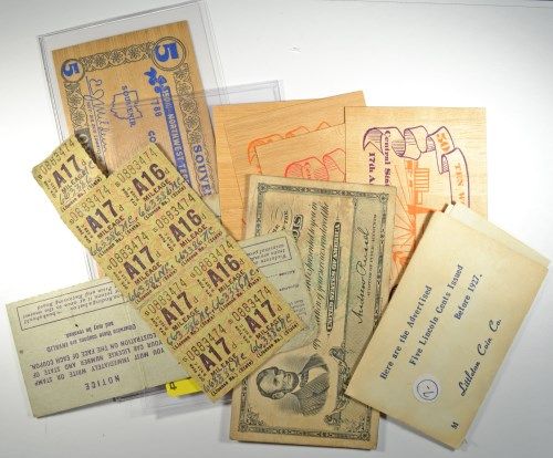 MISC.. LOT OF OF OLD PAPER ITEMS: MILAGE RATION, WOODEN NICKEL BILLS, ECT.
