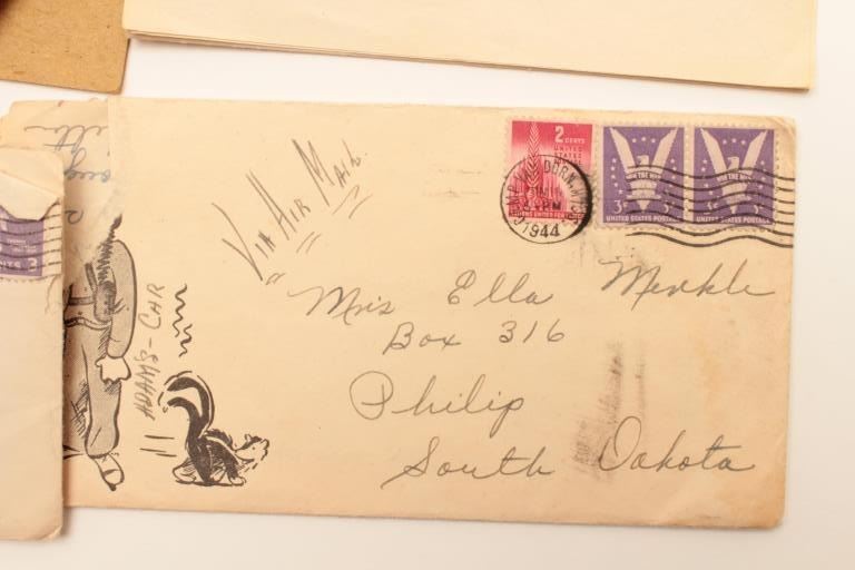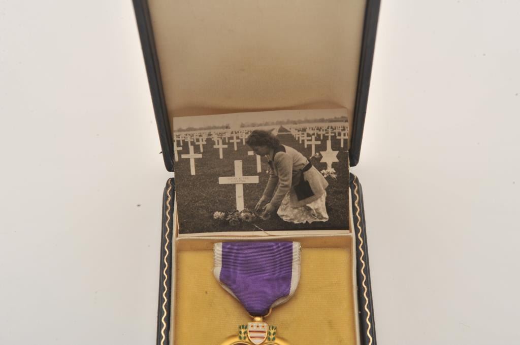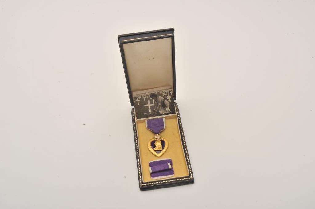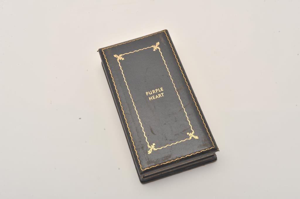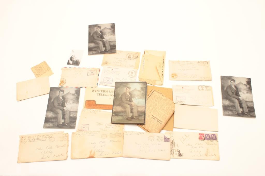 Purple Heart circa WW2 with photos, mail, clippings, telegrams, and announcement of death of commanding officer for Glen E Cok #39342788 KIA Ostrich, Germany March 31, 1945. In SweetHome box which he gave to hismother where it was kept. A great group. Est:$150-300