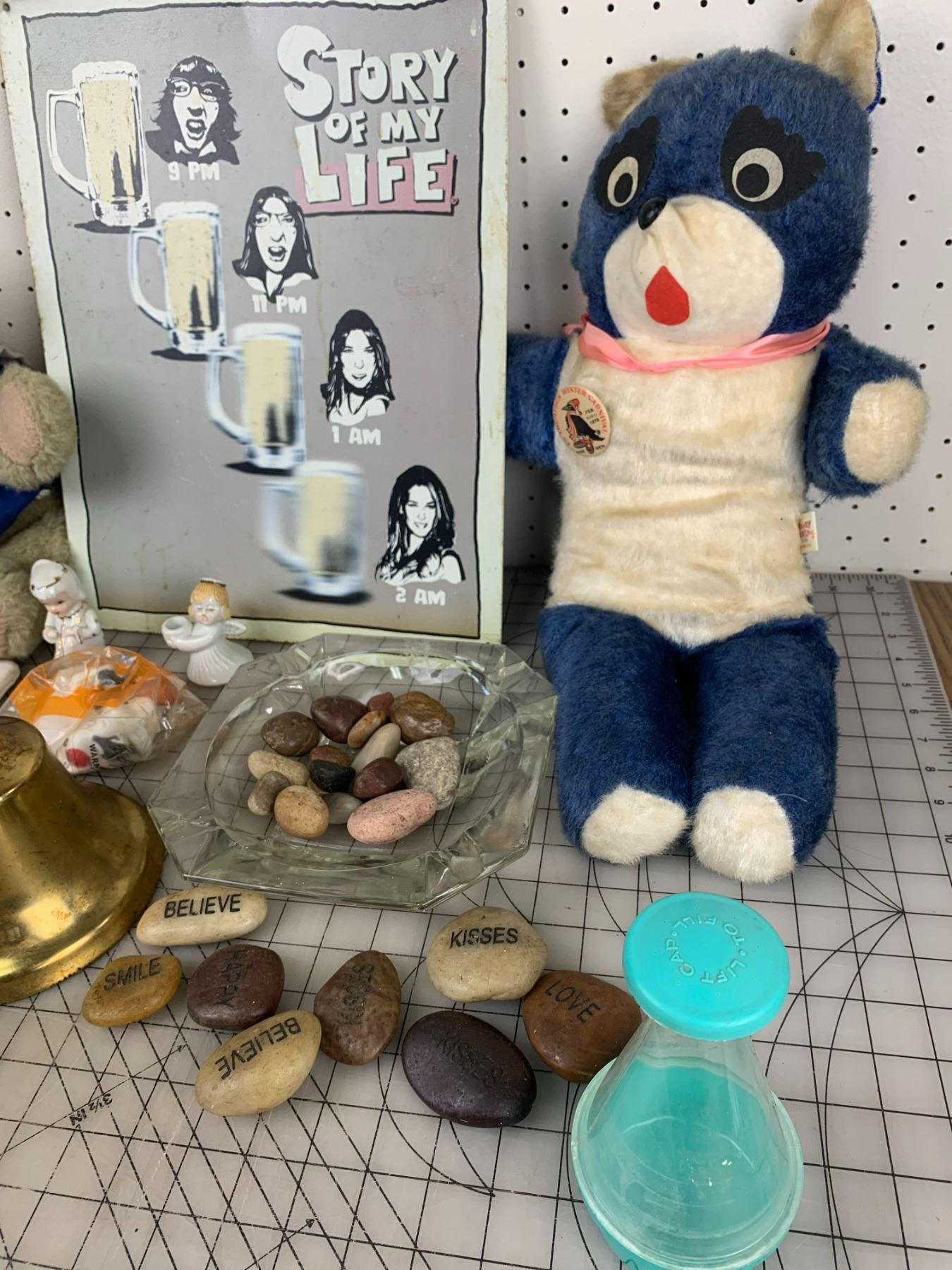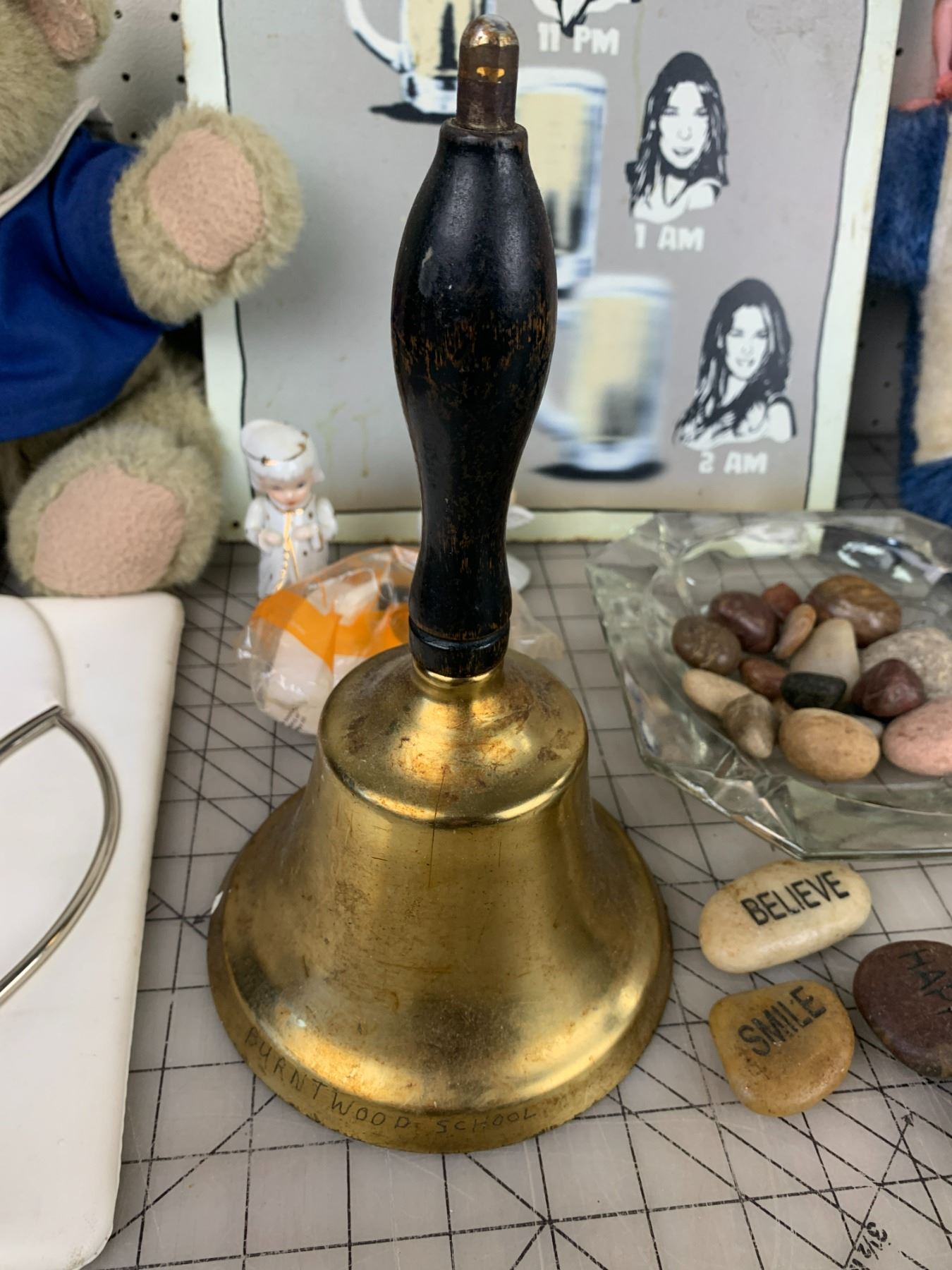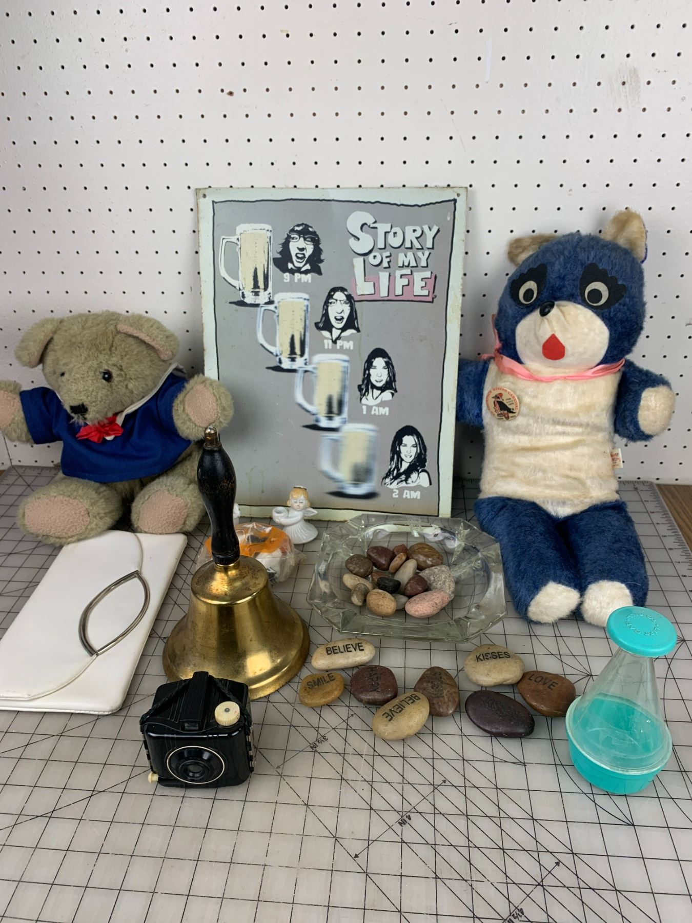 MISC LOT SCHOOL BELL (CRACKED) TEDDY BEARS ROCKS ETC.