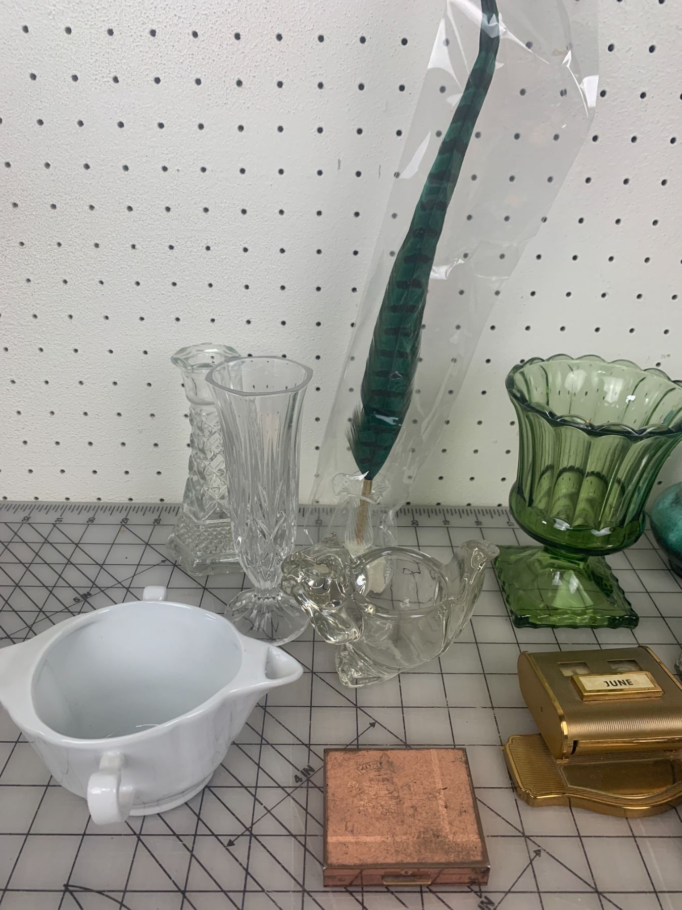 MISC LOT SHELLS FEATHER PEN GLASS ETC