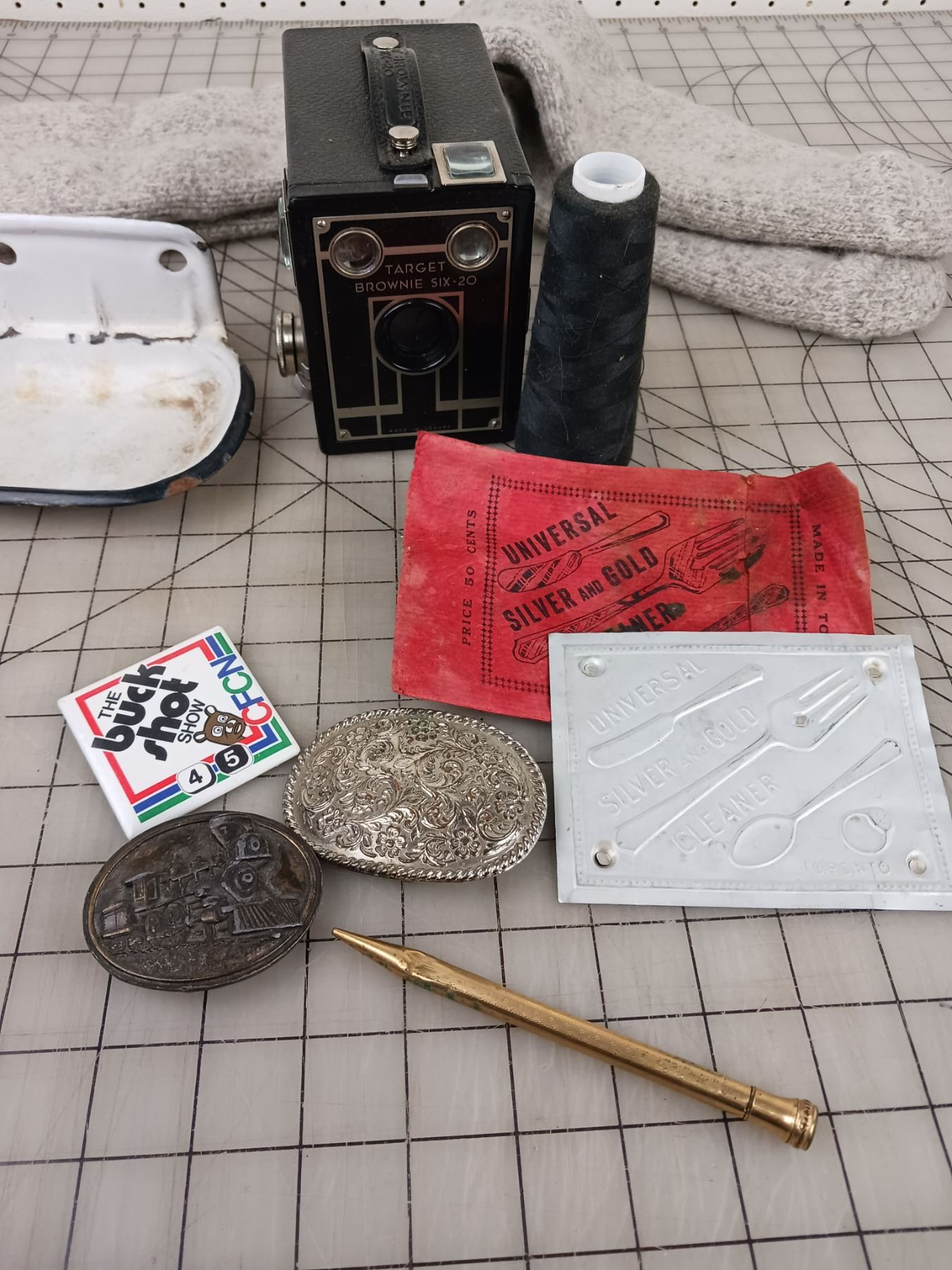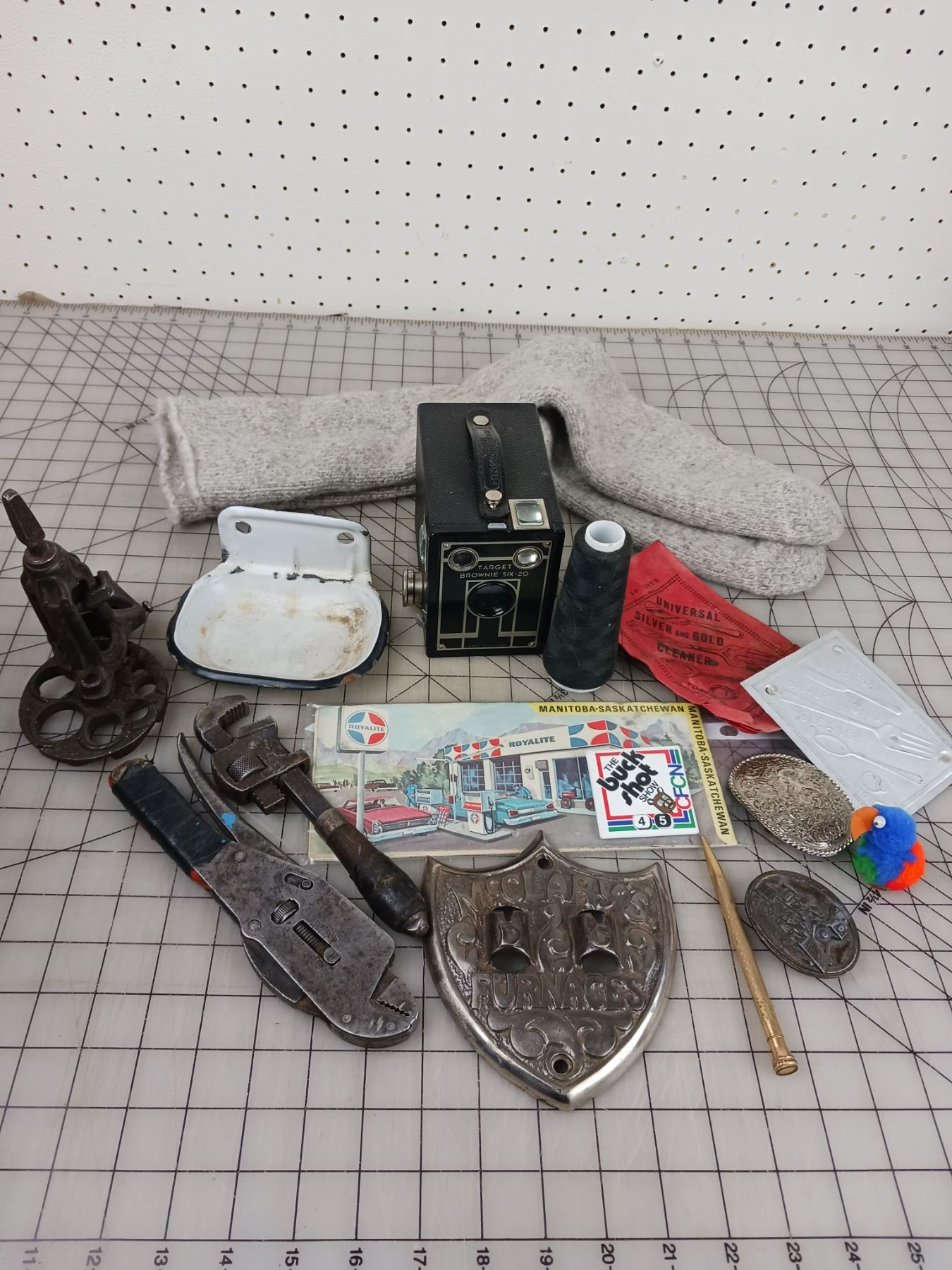 MISC LOT TOOLS ROYALITE ROAD MAP CAMERA BELT BUCKLES ETC