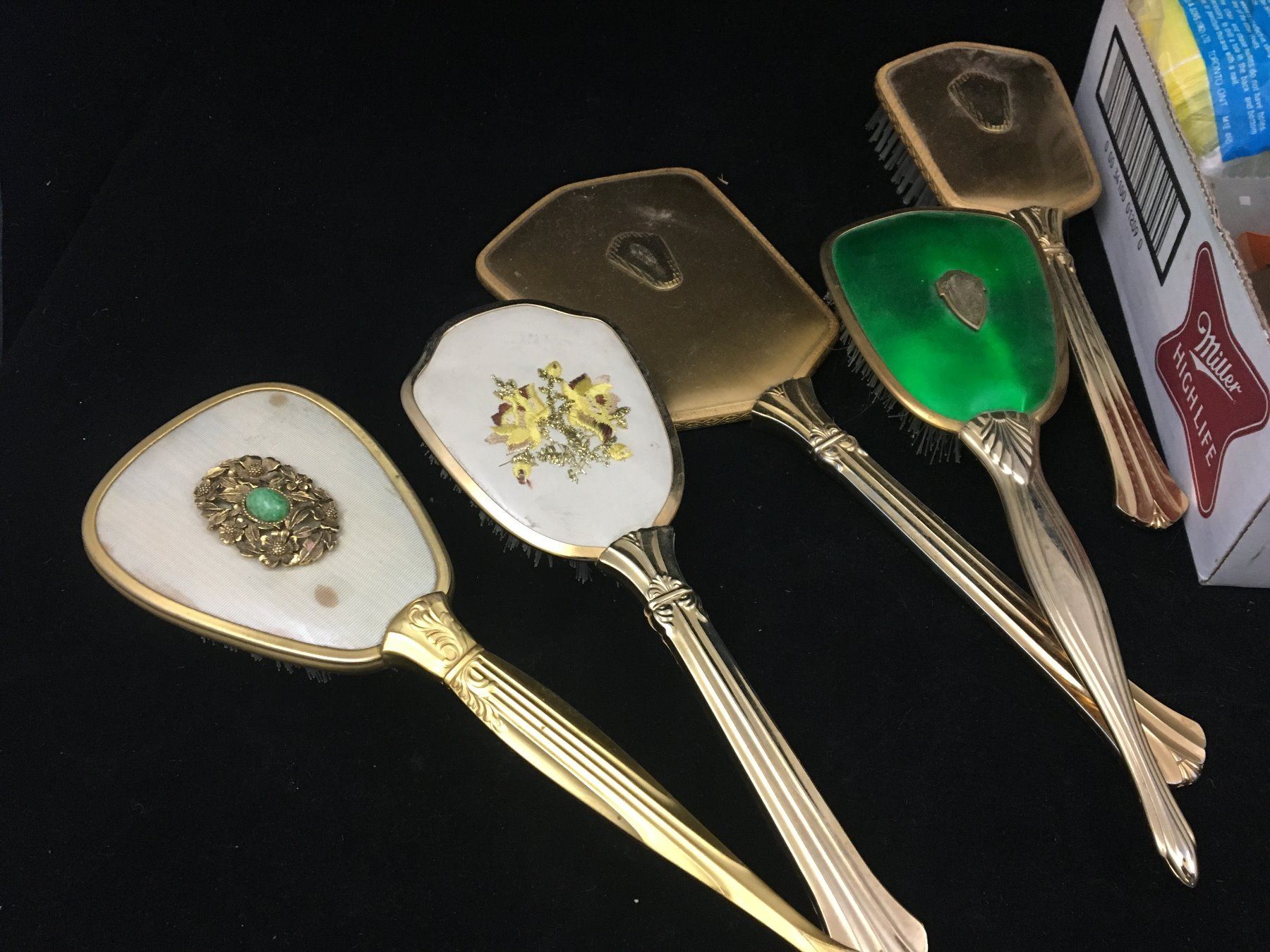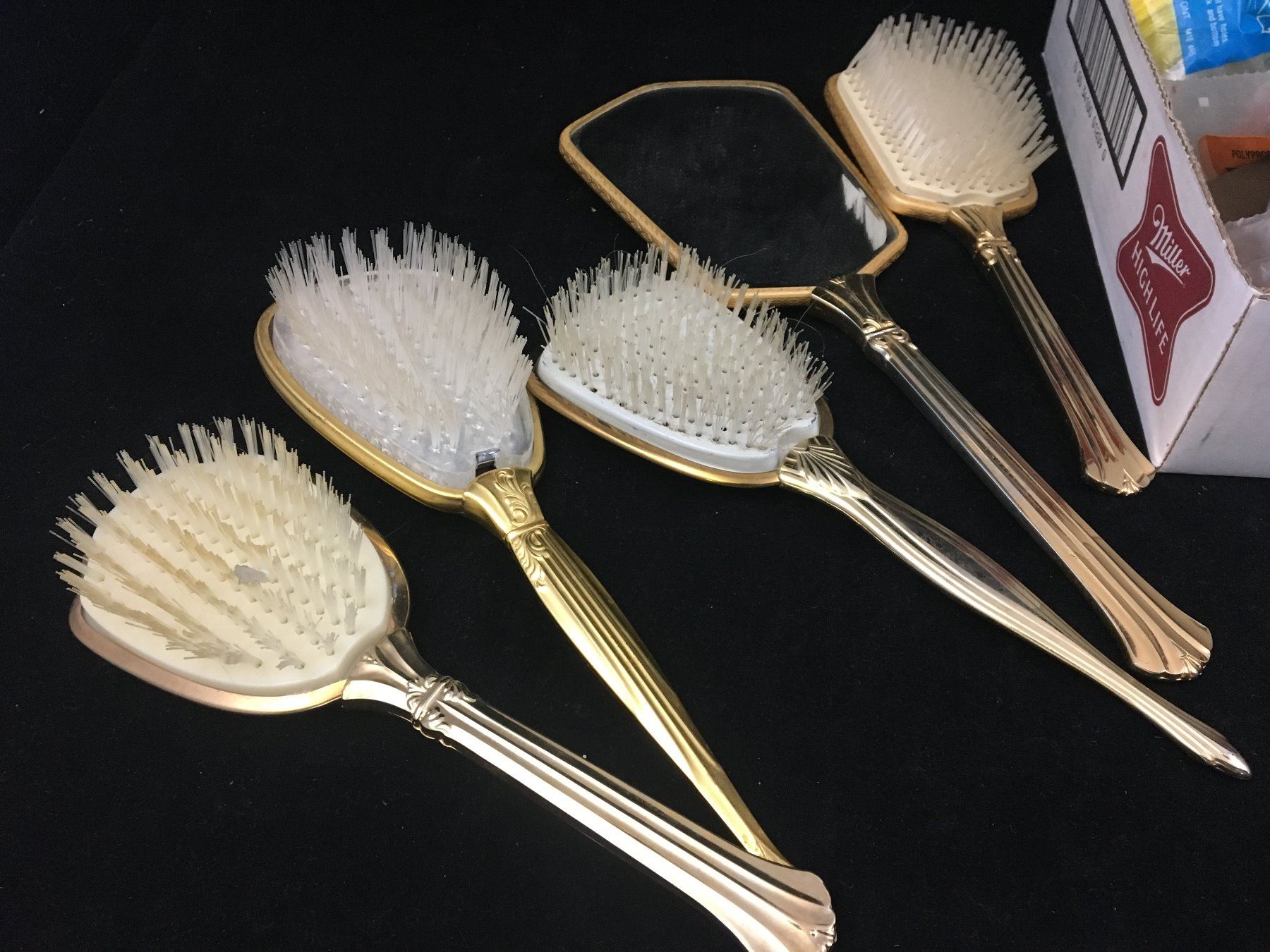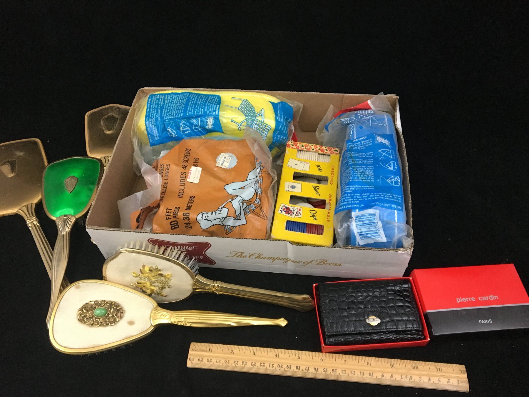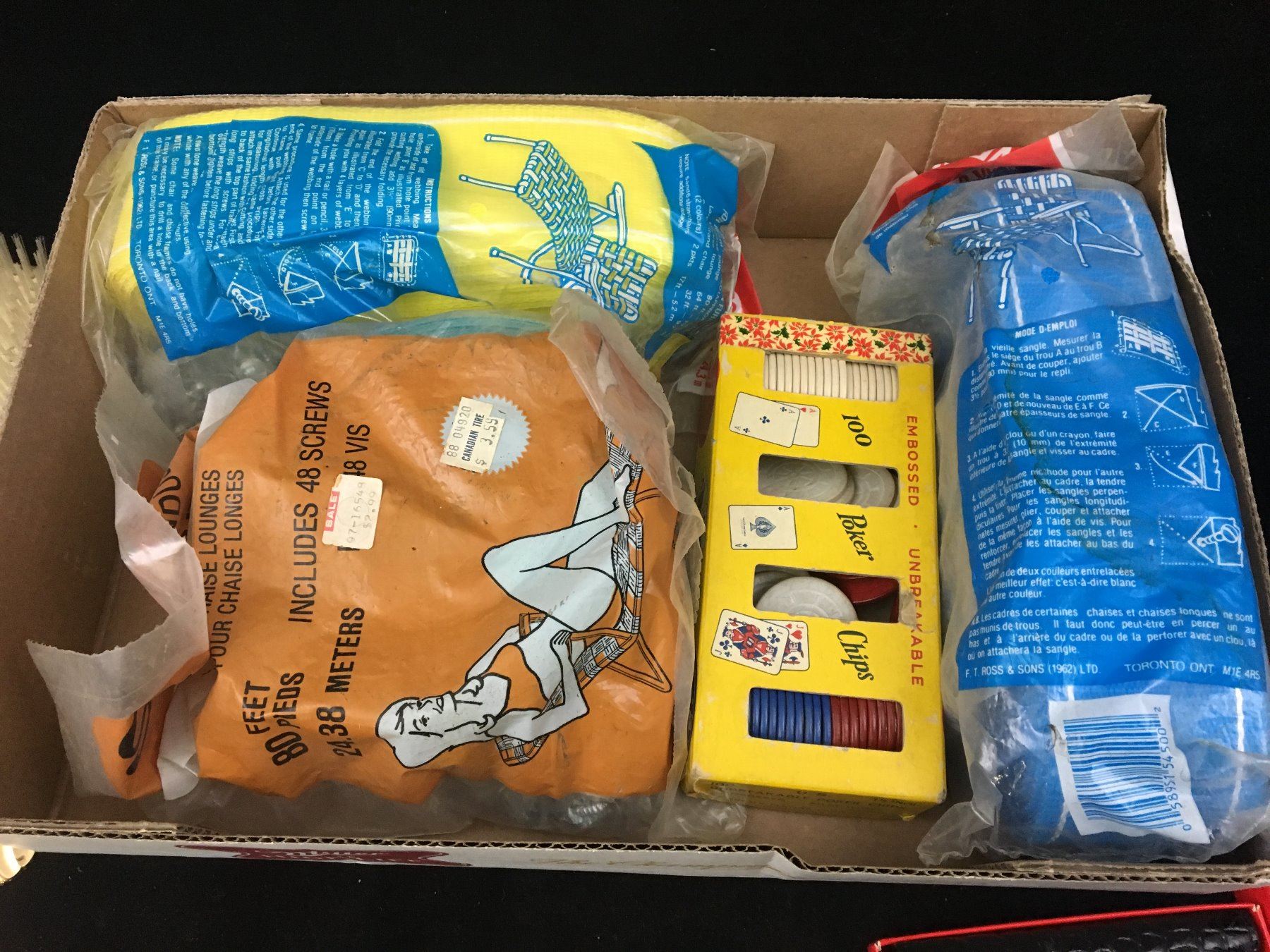 MISC LOT (VANITY MIRROR AND BRUSHES, POKER CHIPS, RETRO LAWN CHAIR WEBBING)