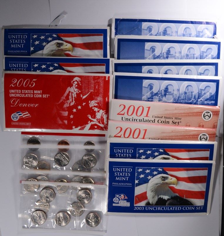 2000-P QUARTERS, 2001-P QUARTERS, 2005-P QUARTERS, 2003-D IN MINT CELLO PACKS, ( 2 )2001-D, ( 4 ) 2002-P, ( 4 ) 2003-P & ( 1 ) 2005-D IN MINT ENVELOPES, TOTAL OF $28.69 FACE VALUE ALONE! ESTIMATE, $60.00 TO $70.00