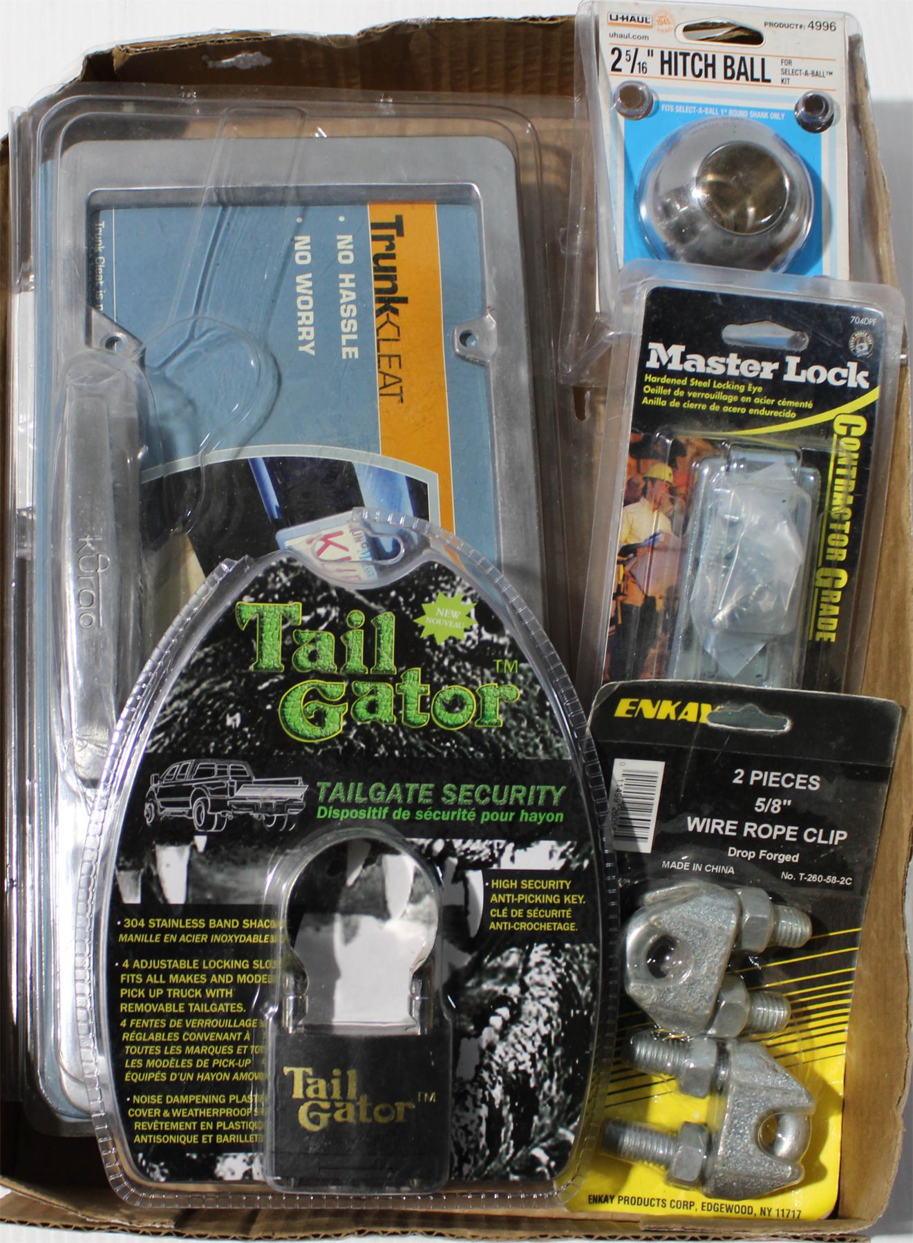 MISC NEW ITEMS, 2&5/16' BALL, TRUNKKLEAT, TAILGATE SECURITY, CABLE CLAMPS, ETC.