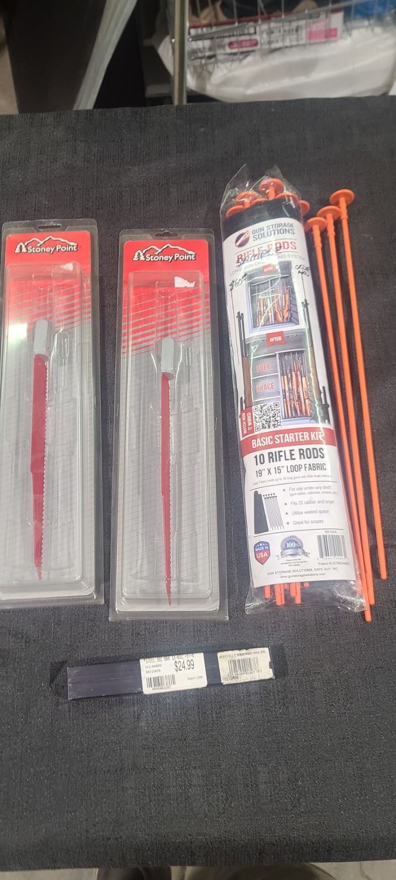 MISC: STONEY POINT POLE SAW BLADES X 2, STEEL 302 BAR 13-802-3-06 CHARGING BAR, PLUS RIFLE RODS FOR STORAGE