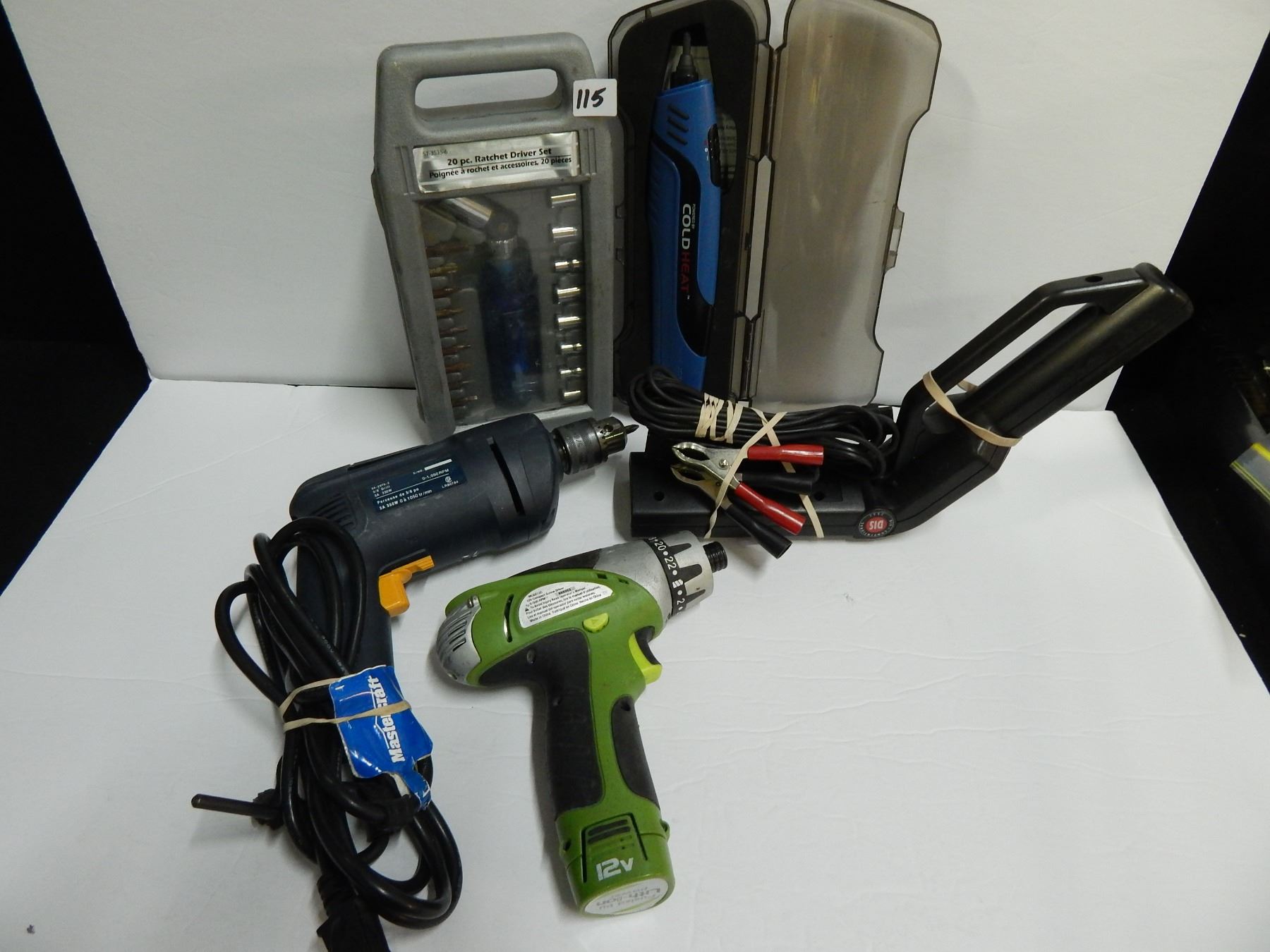 A3 ELEC MAST.CRAFT DRILL/12 VOLT CORDLESS DRILL/TIMING LIGHT/COLDHEAT SOLDING GUN/20PC RACH.SET