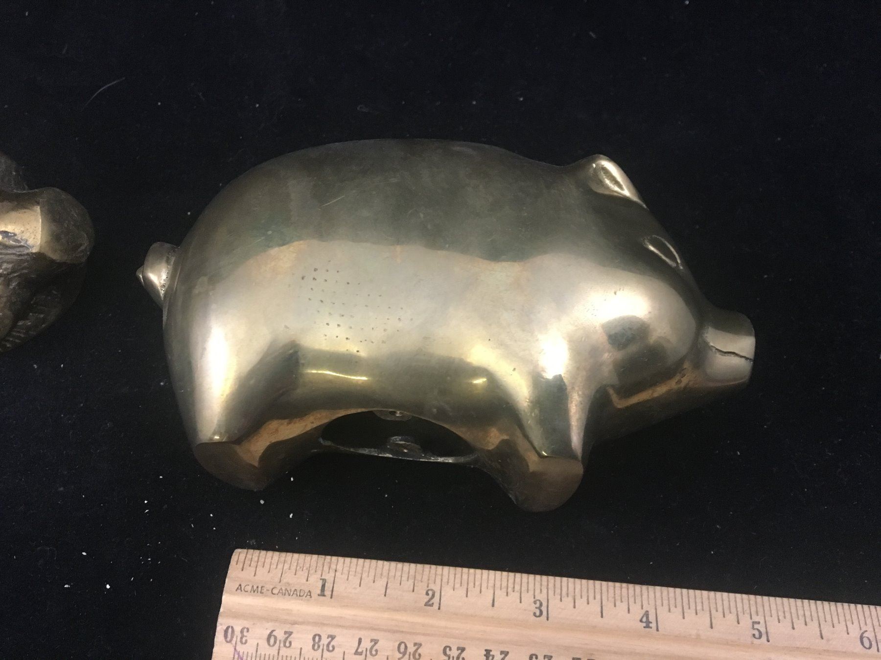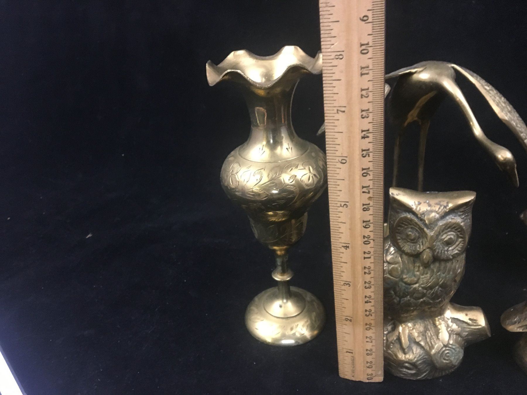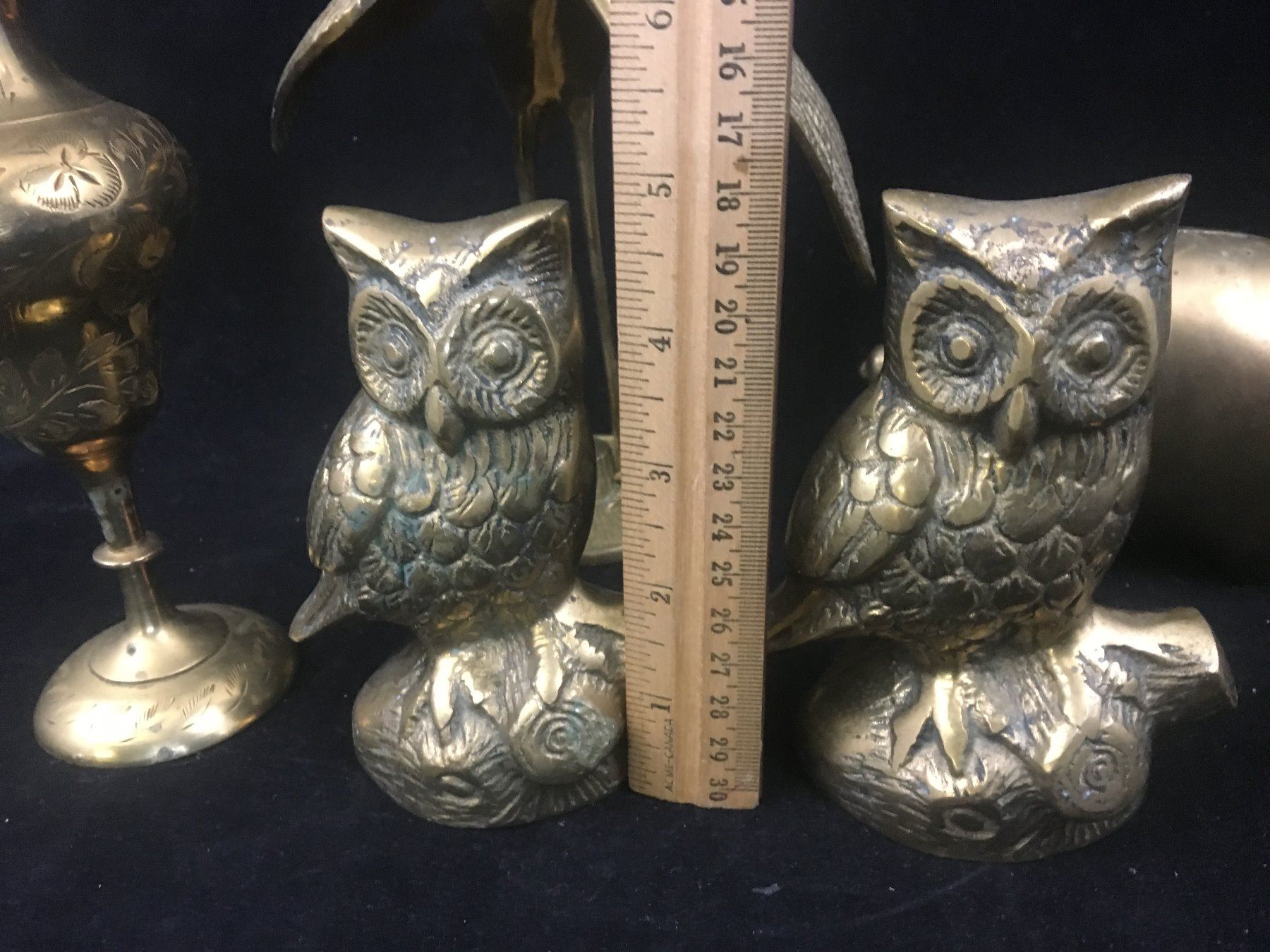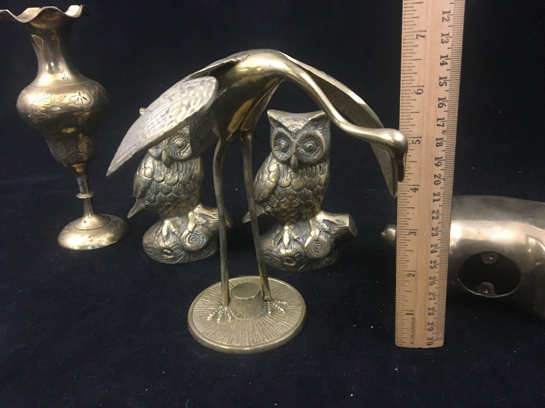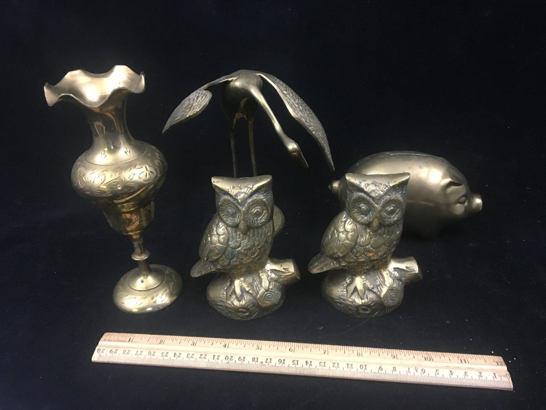 MISC VINTAGE BRASS LOT (PIGGY BANK, CRANE, OWLS)