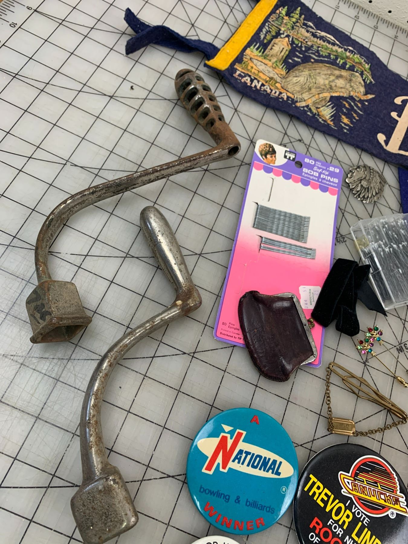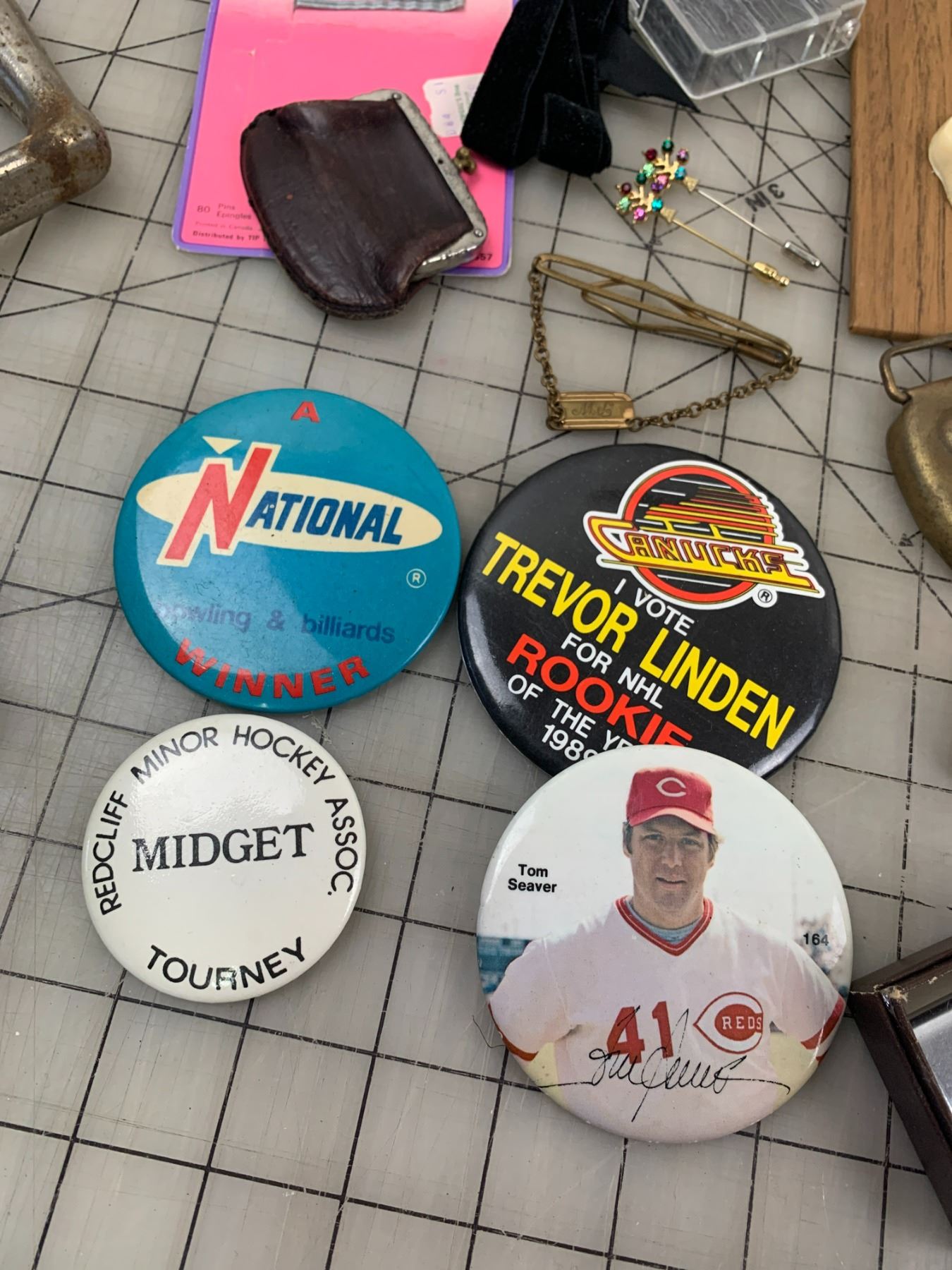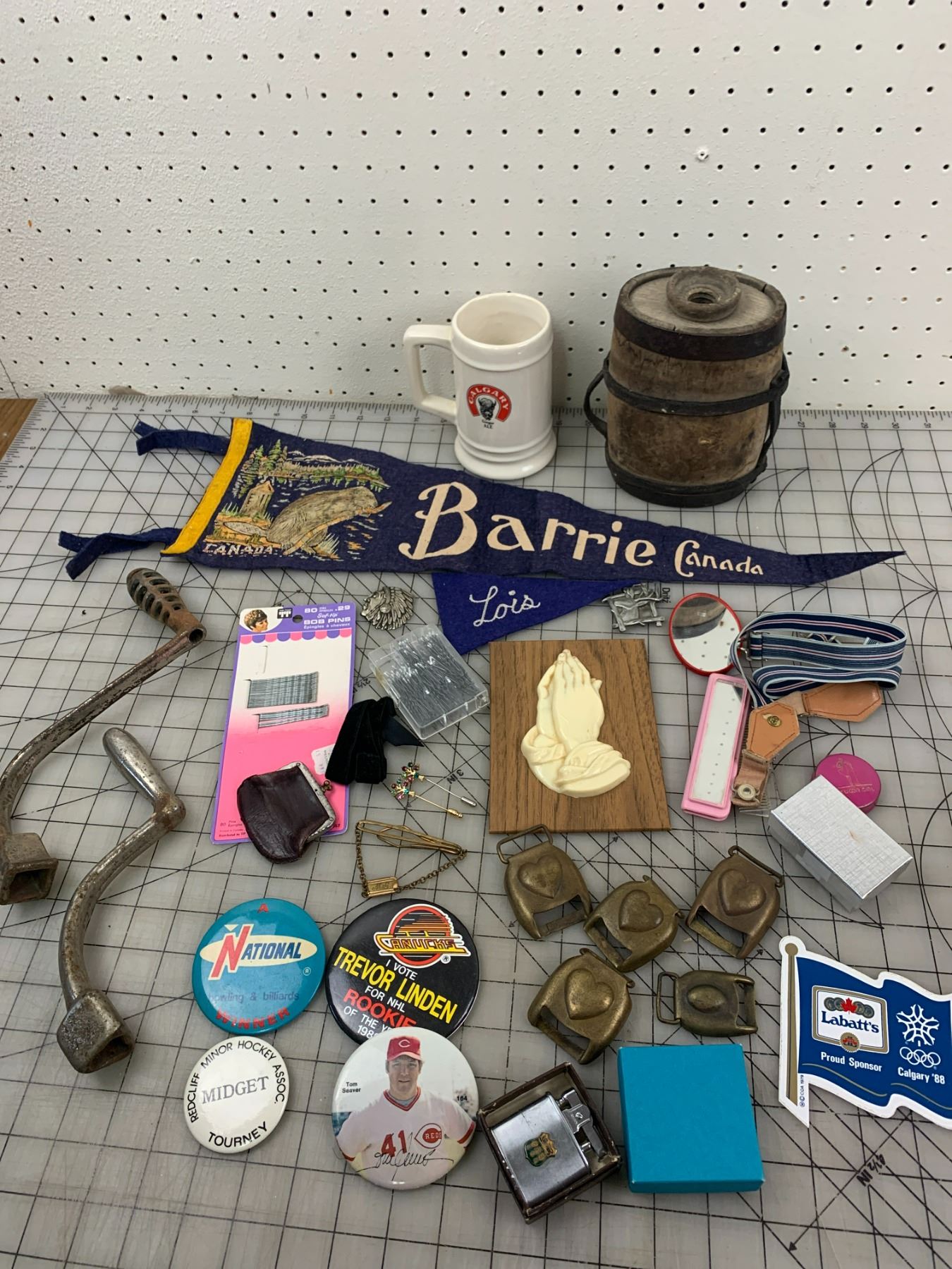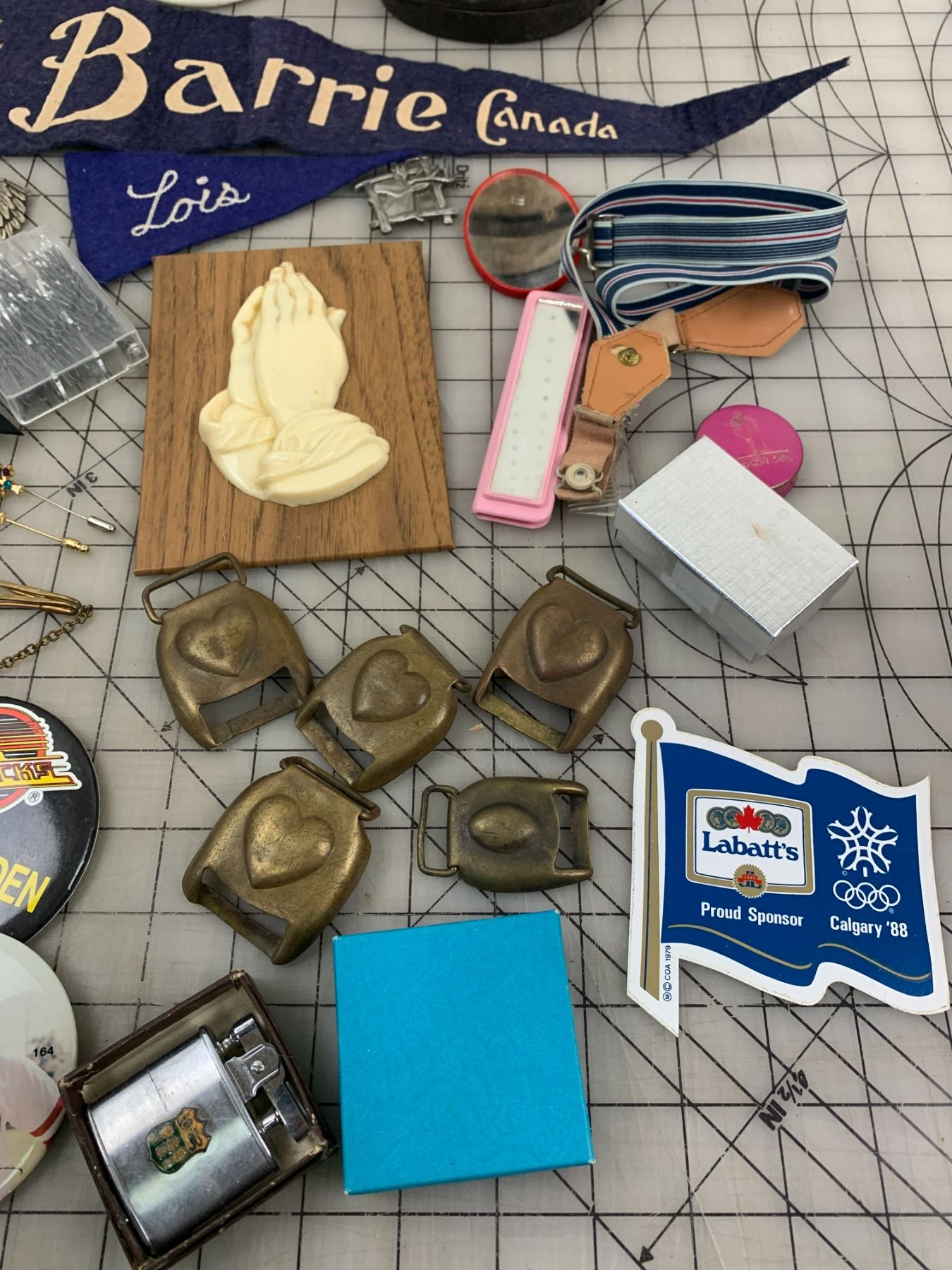 MISC VINTAGE LOT WOODEN CANTEEN HEART TACK BUCKLES SPORTS BUTTONS ETC