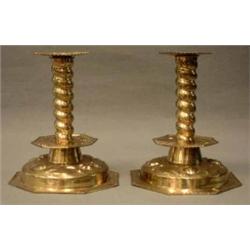 1 PAR LJUSSTAKAR, MÄSSING, OKTAGONAL FOT, RUND GODRONNERAD LJUSPIPA, DRIVEN BLOMDEKOR, LÖSA MANSCHETTER, BAROCKSTIL SIGN. W. BRATT JÖNKÖPING, H25