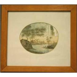 SIDENBRODERI, MOTIV AV HUS OCH KYRK VID SJÖ, 17/1800-TAL, H20, B23 (SENARE INRAMNING, SKADOR)