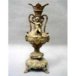 LJUSSTAKE, BRONS, I FORM AV URNA, DEKOR AV BOCKHUVUDEN, BLOMSTERSLINGOR OCH SITTANDE POJKE, H43