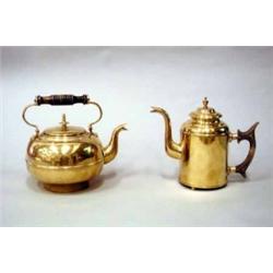 TEKANNA, MÄSSING, SVARVAT TRÄHANDTAG, ÖSTBERG, ESKILSTUNA, KANNA, MÄSSING, RUND MED TRÄHANDTAG, LAGERSTRÖM, ESKILSTUNA, C. 1900, H16+18 (2)
