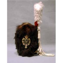 GRENADJÄRSMÖSSA, MÖSSA AV BJÖRNSKINN, VAPENPLÅT AV MÄSSING MED LILLA RIKSVAPNET, VIT PLYM OCH TOFSAR, H65
