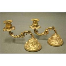 1 PAR FLYGELLJUSSTAKAR, GJUTEN MÄSSINGSOCKEL MED BLADDEKOR, SVÄNGDA LJUSARMAR, LÖSA MANSCHETTER, NYROKOKO 1800-TALETS ANDRA HÄLFT, H15, L22