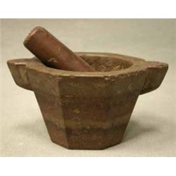 MORTEL MED STÖT, KALKSTEN, BRUN, OKTAGONAL, KASAD FORM, KANTIGA HÄNKLAR, TIDIGT 1800-TAL, H13, D24