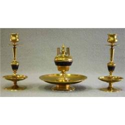 SKRIVBORDSGARNITYR, MÄSSING, 2 LJUSSTAKAR, BLÄCKHORN, BLÄCKHORN MED BLÅ EMALJ, C. 1900, LJUSSTAKAR H21