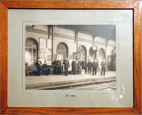 FOTOGRAFI, JÖNKÖPINGS CENTRALSTATION MED PERSONAL, ÅR 1900, ATERGO PÅSKRIFT, EKRAM, 28X35