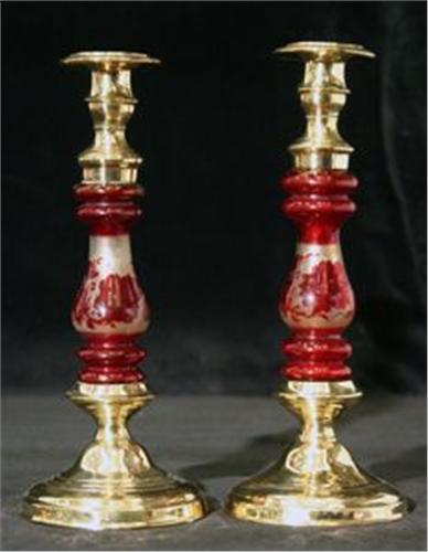 1 PAR LJUSSTAKAR, FOT OCH LJUSPIPA AV MÄSSING, MITTSTAM I RÖTT UNDERFÅNGSGLAS, BÖHMEN, 1800-TAL, H25 (2)