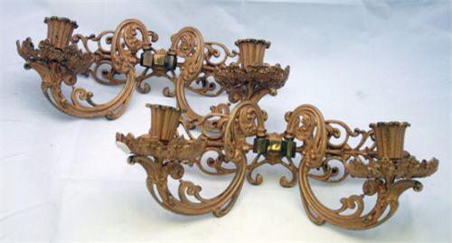 1 PAR VÄGGAPPLIQUER FÖR VARDERA TVÅ LJUS, FÖRGYLLD MÄSSING, EMPIRFORMAT VÄGGFÄSTE, SVÄNGDA LJUSARMAR, NYROKOKO, 1800-TAL, H14, B33
