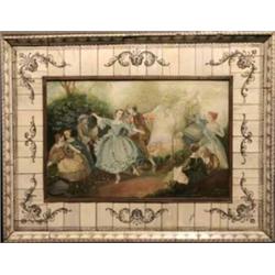 MINIATYRMÅLNING, SIGN. M DAWE ?, ROKOKOFIGURER I PASTORALT LANDSKAP, RAM I ELFENBEN MED DEKOR AV BLAD, 18/1900-TAL,16X24