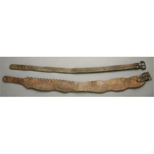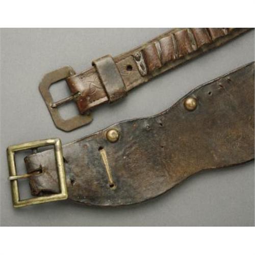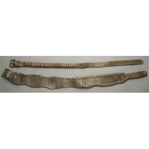 <B>MISCELLANEOUS BELTS</B></I> - <BR>a) Narrow (1¼”) belt with stitched cartridge loops; great old belt with frontier character; well used <BR>b) Home-made studded bronc belt; name carved in leather.<BR><BR><b>Shipping:</b> Miscellaneous Collectibles, Larg (<a target="_blank" href="http://www.heritageauctions.com/common/shipping.php">view shipping information</a>)
