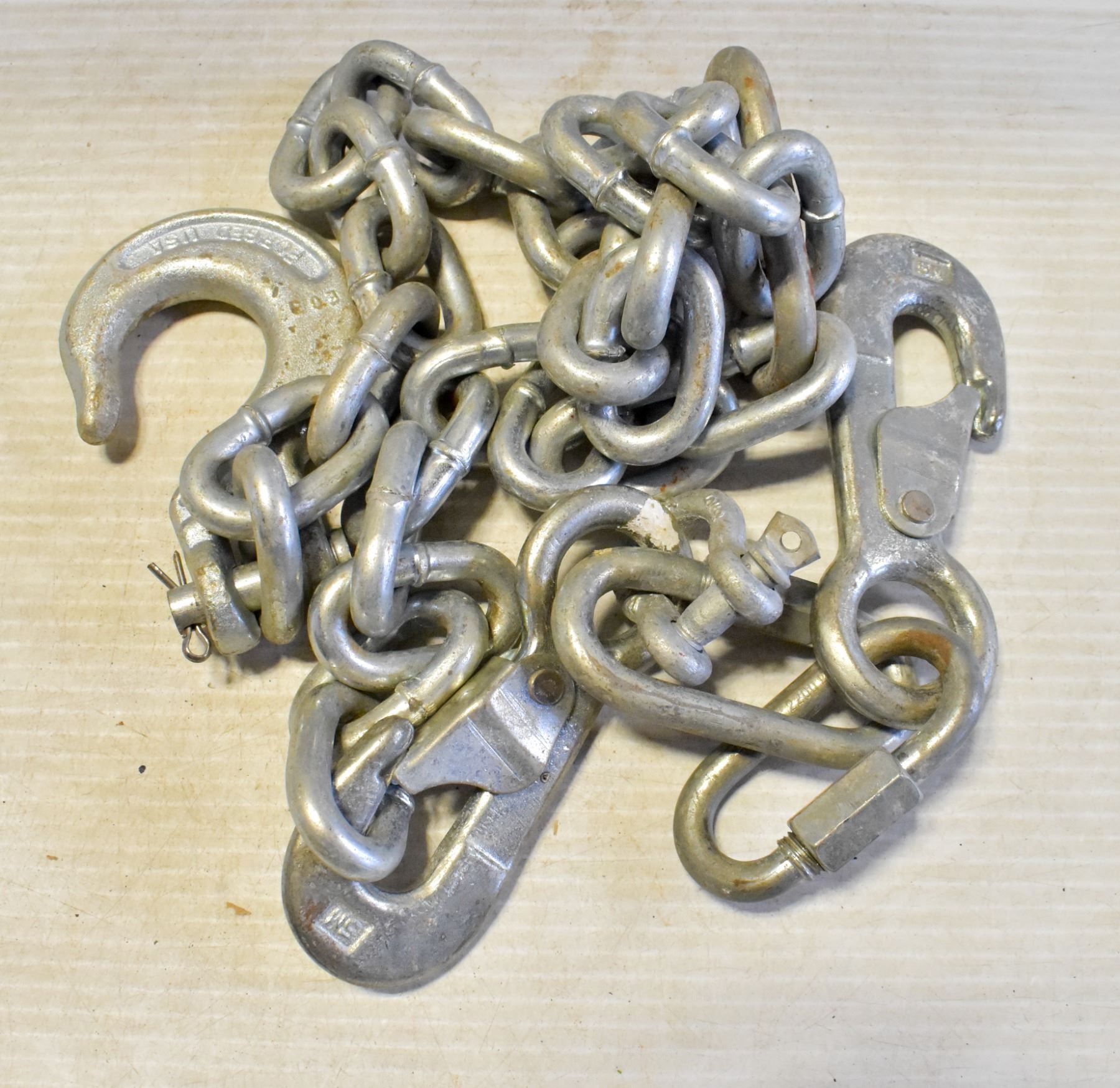LOT OF 1 EACH ONE FOOT OF HEAVY CHAIN, 1 EACH OF 2 FEET OF HEAVY CHAIN, 2 EACH OF SLIP LOCK CLIPS, 3 EACH REPAIR CHAIN LINKS, AND 1 EACH HOOK