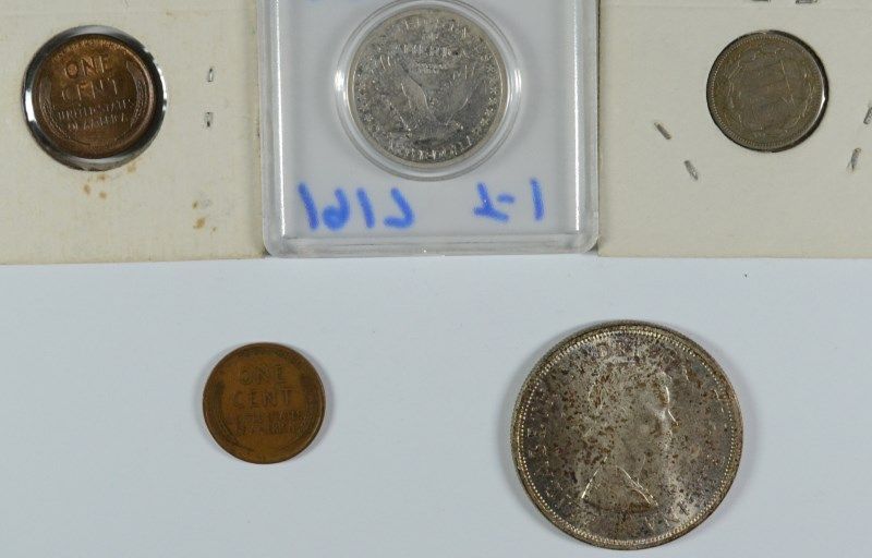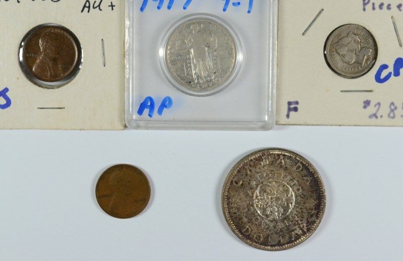 1964 CANADIAN SILVER DOLLAR, BU, 1867 3 CENT PIECE, FINE, 1917 TYPE-1 STANDING LIBERTY QUARTER, VF, 1909 VDB LINCOLN CENT, VF AND 1909-VDB LINCOLN CENT, AU+ SOME VERY NICE COINS! ESTIMATE, $125.00 TO $140.00