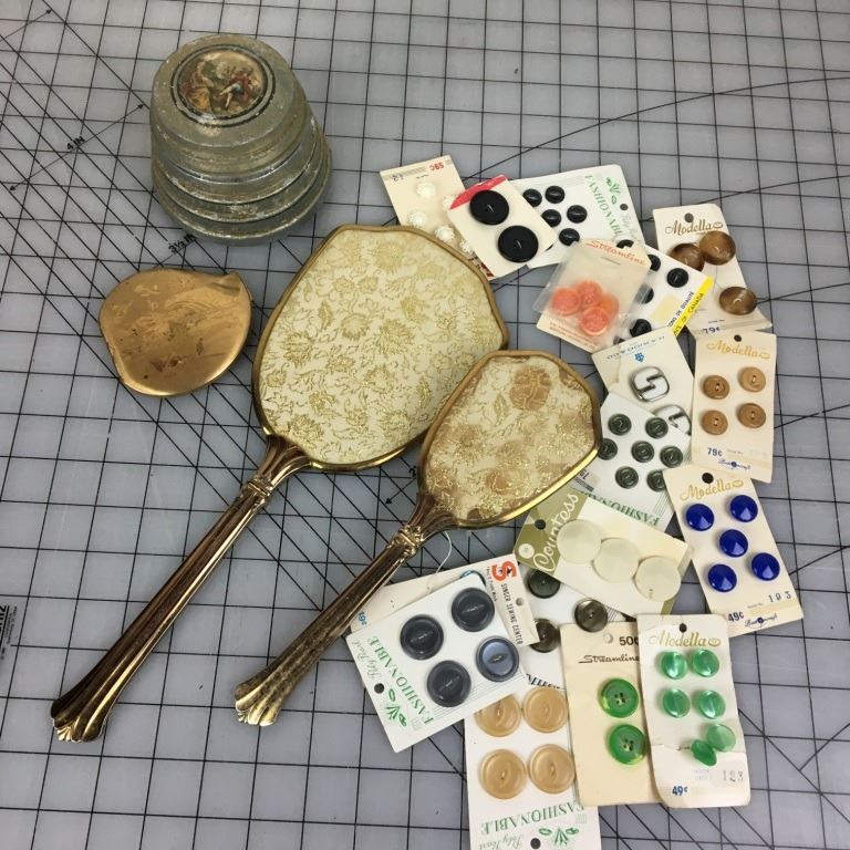 MISCELLANEOUS LOT CARDED BUTTONS, POWDER BOX COMPACT…