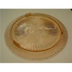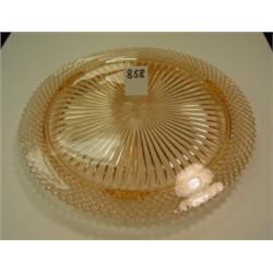 "Miss America" pink depression glass cake plate. Footed. Round. 12" diameter. Condition: No notable defects
