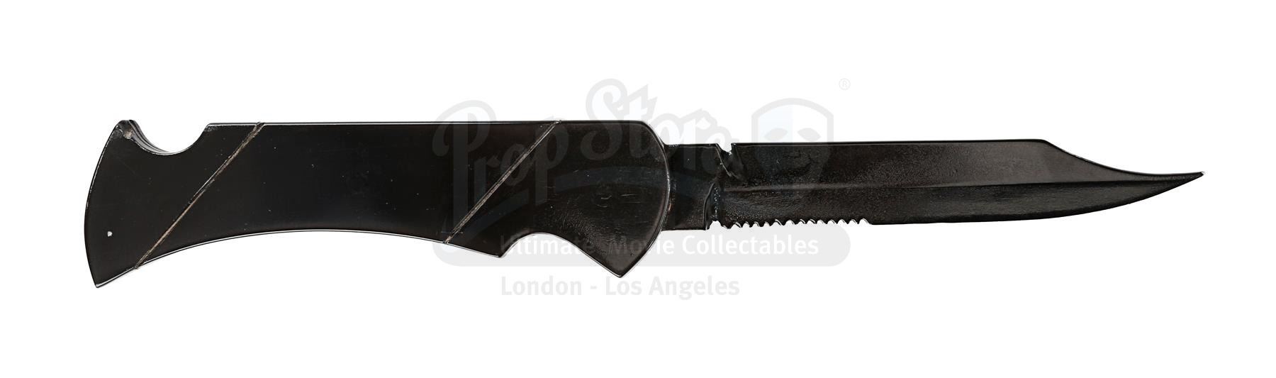 Made of resin, the black weapon features a curved blade tip and a serrated edge. The holographic computer disk is housed inside a transparent plastic case that displays a metal section with "Verbatim, 230 MB, Rewritable Optical Disk" printed in black. Both items in the lot display minor wear from production use and minor damage is present on the knife handle. Dimensions (knife): 27 cm x 4 cm x 1.5 cm (10 3/4" x 1 3/4" x 3/4"); (disk): 9.5 cm x 9 cm x 0.5 cm (3 3/4" x 3 1/2" x 1/4")