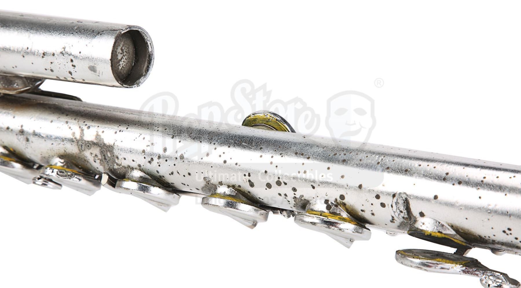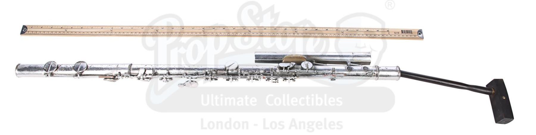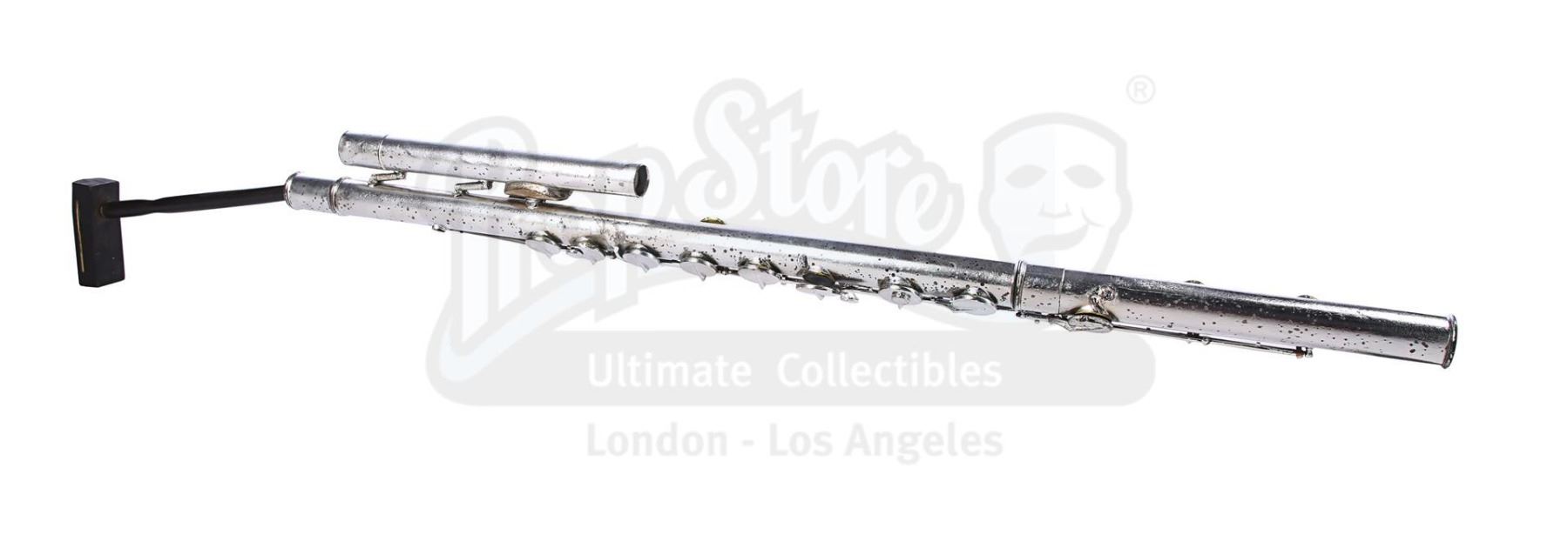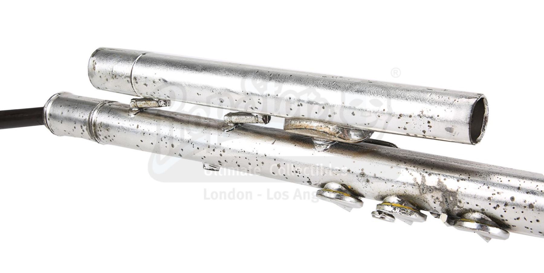 The rifle is made predominantly of resin painted faux silver, and has a metal armature. It features a buttstock, which can be rested in the shoulder. There are chips to the paintwork and some of the keys and mechanism have come away, revealing the metal rods beneath. There is a small amount of black spotting along the rifle and a crack where the butt meets the body of the flute. Dimensions: 112 cm x 4 cm x 16 cm (44" x 1 1/2" x 6 1/4")