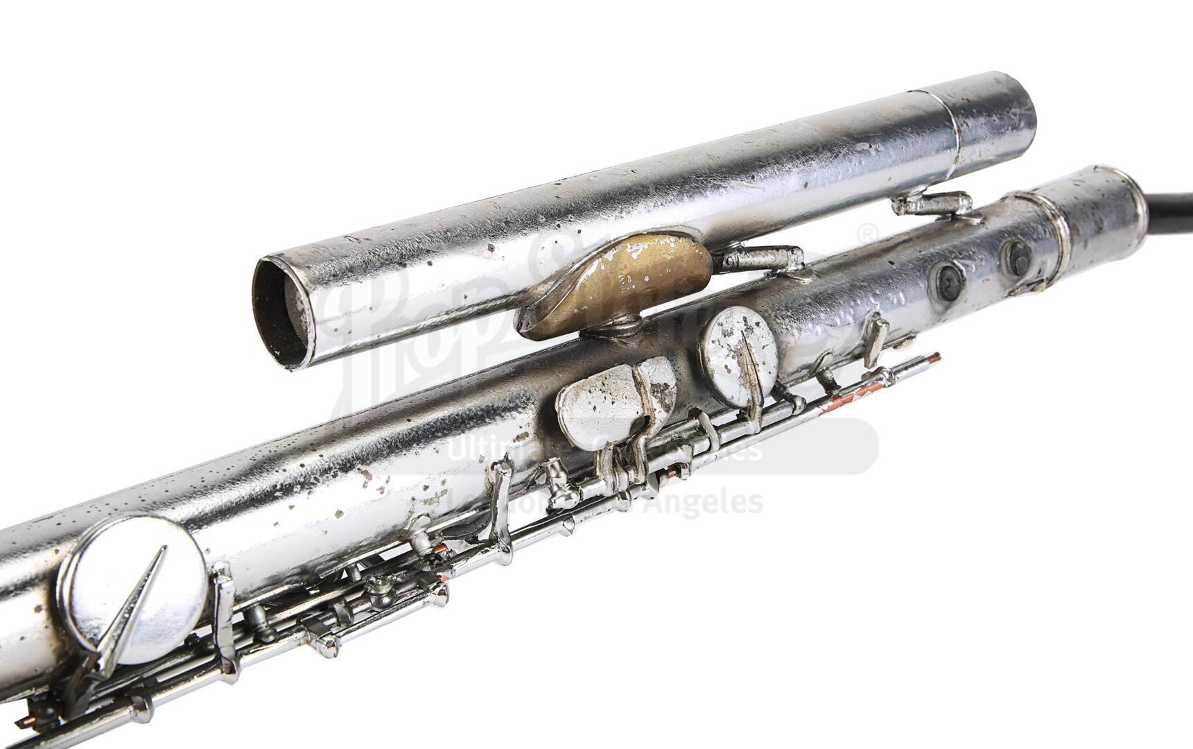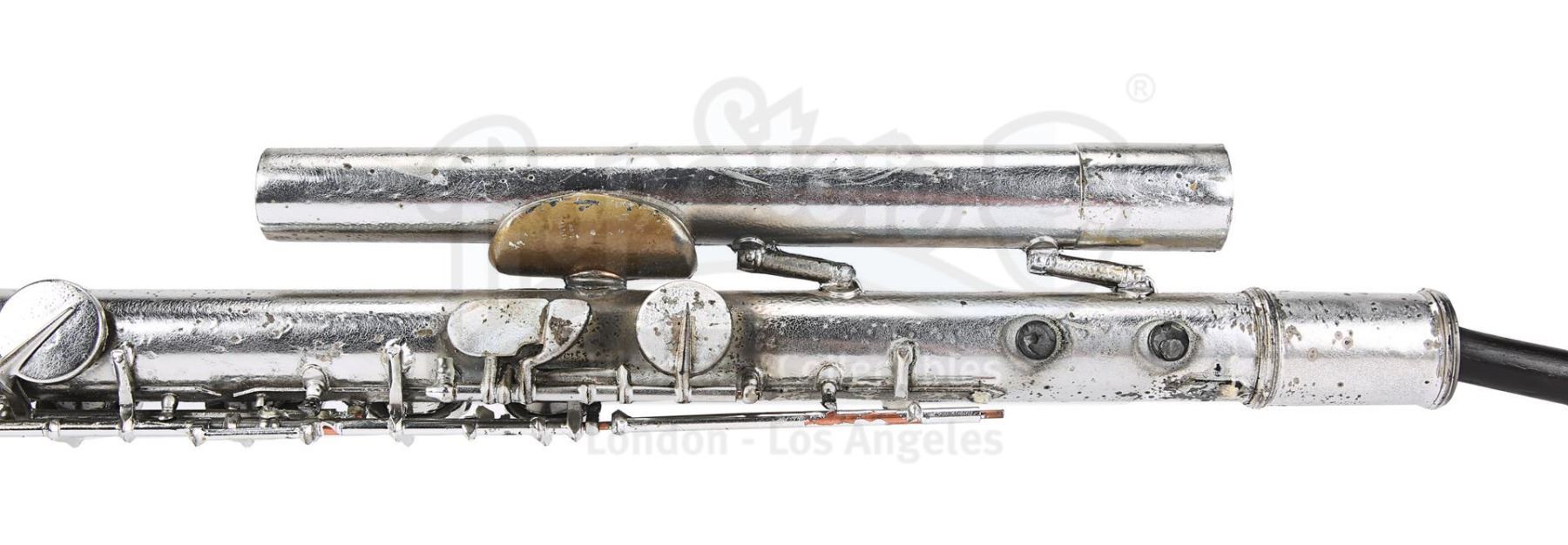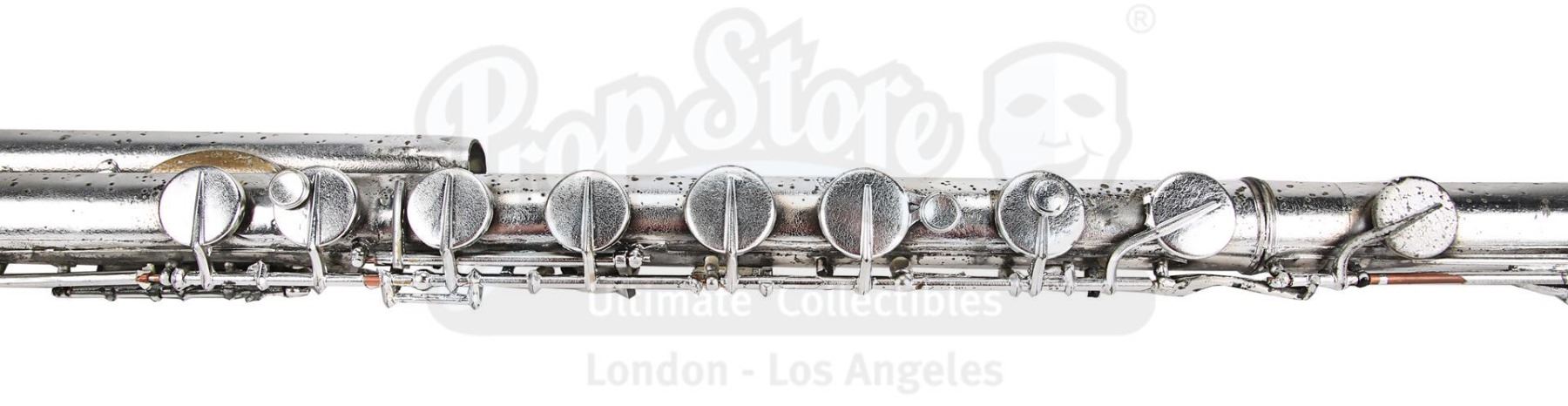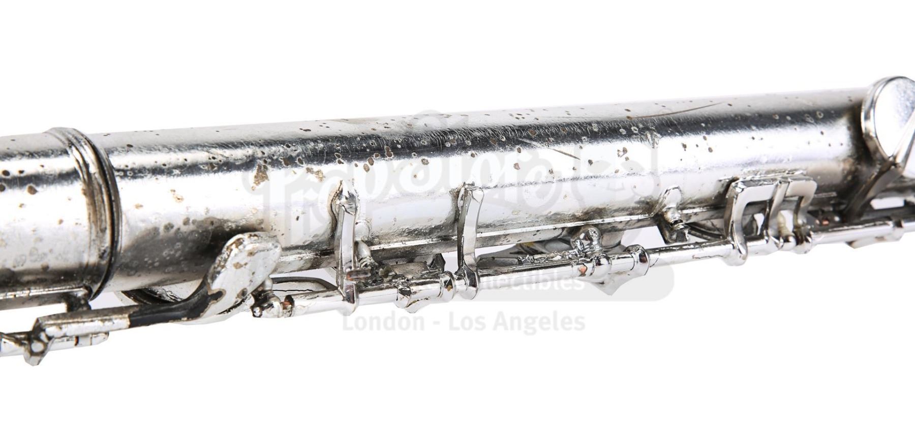 The rifle is made predominantly of resin painted faux silver, and has a metal armature. It features a buttstock, which can be rested in the shoulder. There are chips to the paintwork and some of the keys and mechanism have come away, revealing the metal rods beneath. There is a small amount of black spotting along the rifle and a crack where the butt meets the body of the flute. Dimensions: 112 cm x 4 cm x 16 cm (44" x 1 1/2" x 6 1/4")