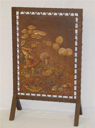 MISSION OAK FIRESCREEN W/ ARTS & CRAFT TOOLED LEATHER SCRREN DECORATED W/ MUSHROOMS & FLOWER, UNMARKED (40" H X 25" W X 13" D) - OLD FINISH, SEVERAL SMALL LEATHER STRAPS DAMAGED, WEAR & IMPERFECTIONS