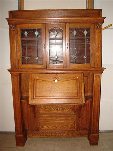 MISSION OAK WALL SECRETARY. Has two lead glass doors at top with lead glass insert over a slant lid that opens to reveal pigeon hole desk. Has galley at top with squared columns at sides that terminate at the top of the slant lid. 81” H, 54” W, 10.75” D
