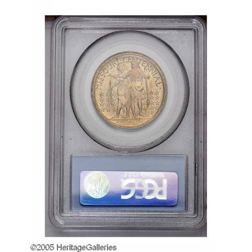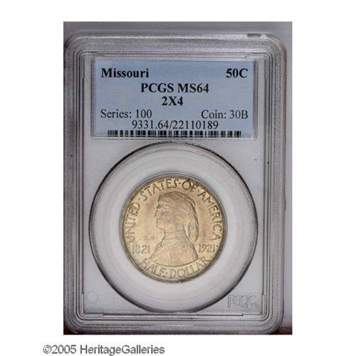 <B>1921<50C> Missouri 2x4 MS64 PCGS.</B></I> Ice-blue and gray-beige patina overlays lustrous surfaces that exhibit sharply struck motifs. A few small marks on the cheek of the obverse portrait limit the grade.<BR><I>From The Henry R. Luhrs Collection.</B></I>
