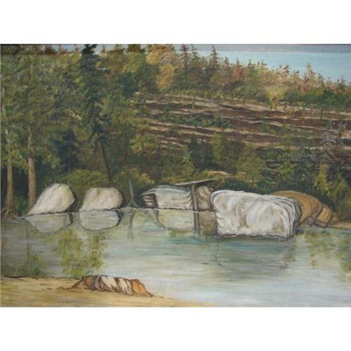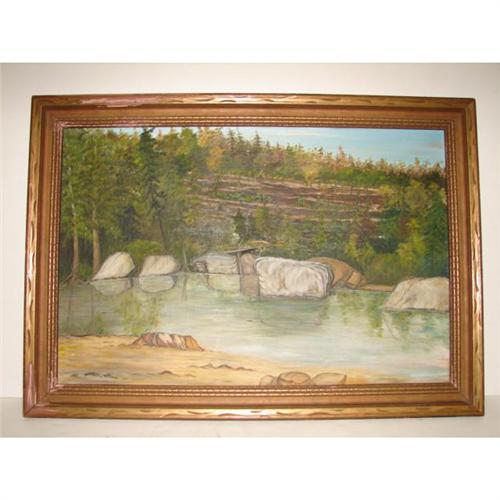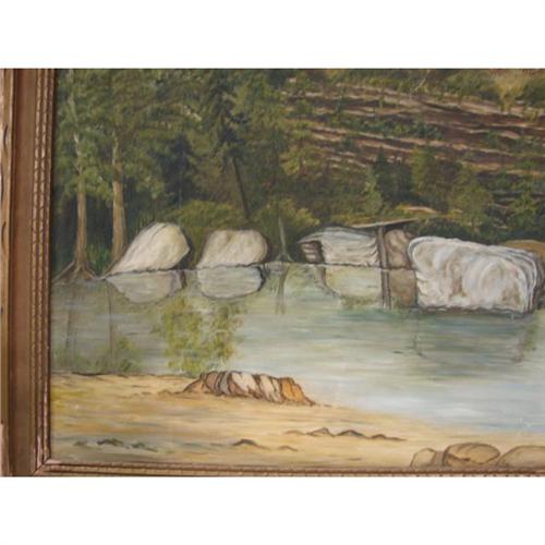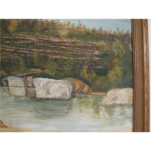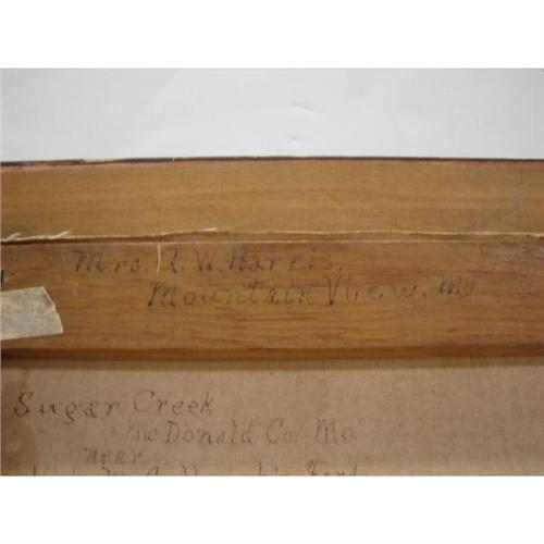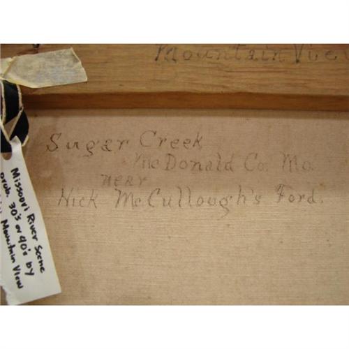 FRAMED EARLY 20TH CENTURY MISSOURI OIL ON CANVAS PAINTING. Depicts a small stream near forest. Signed on back of stretcher “Mrs. G.W. Harris/Mountain View, Mo./Sugar Creek/McDonald Co., Mo./near/Nick McCullough’s Ford”. 16” x 24”.