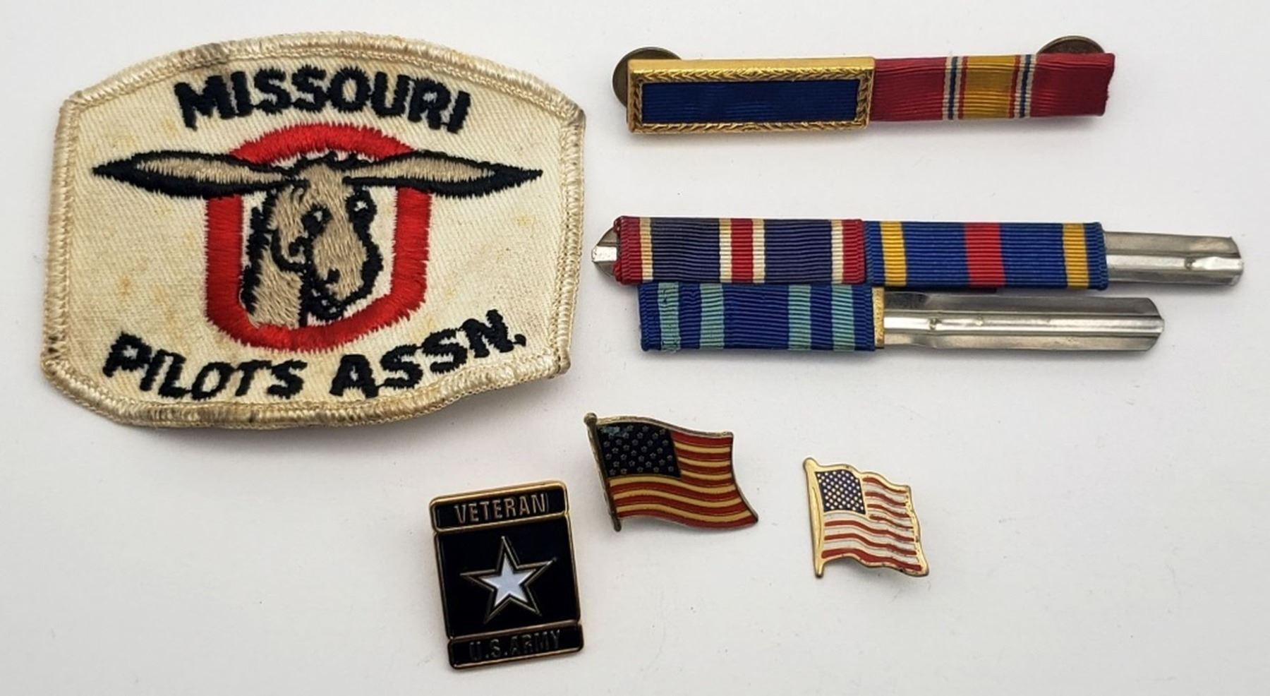 MILITARY AWARD BARS; 2-FLAG PINS; 1-U.S. ARMY VETERAN PIN