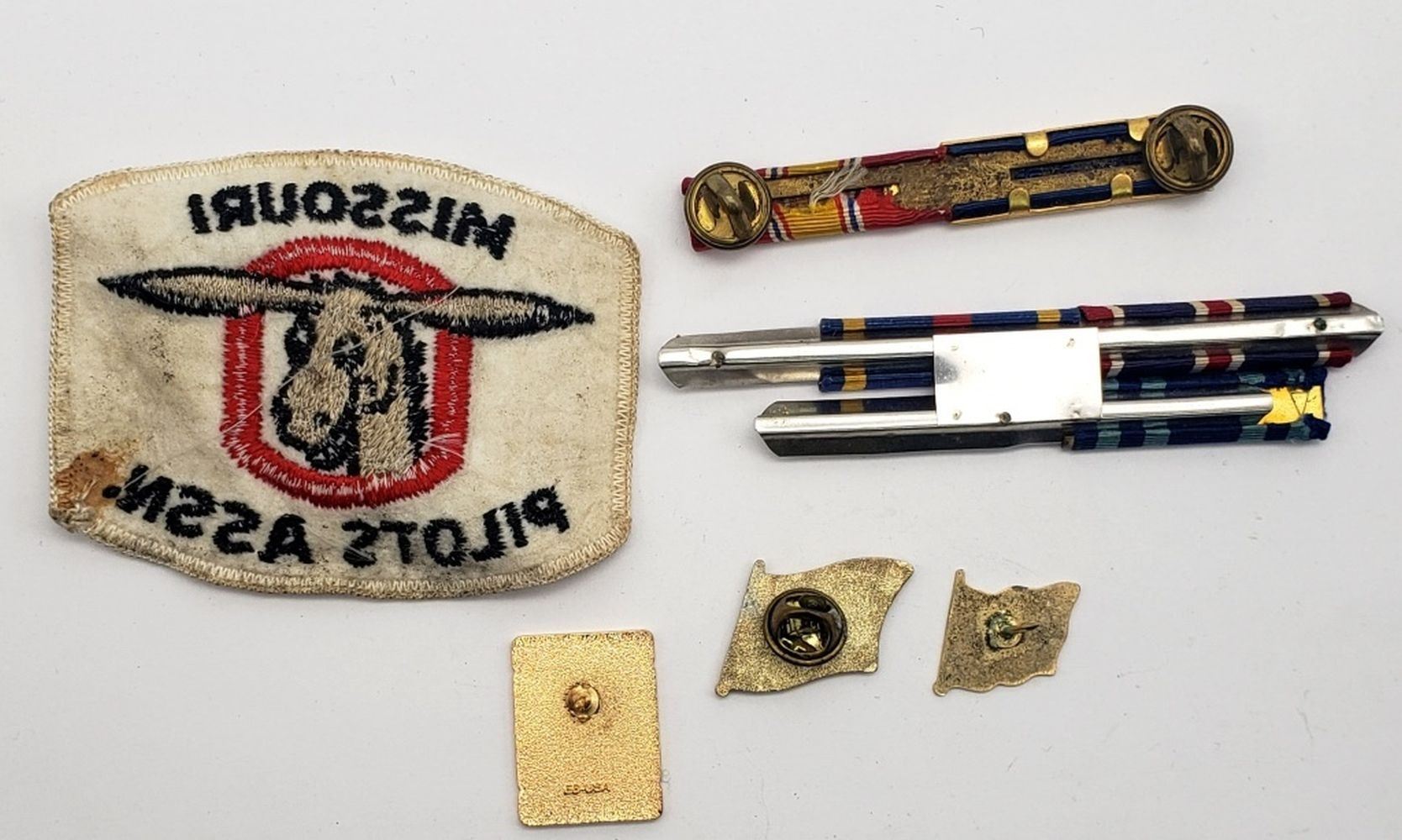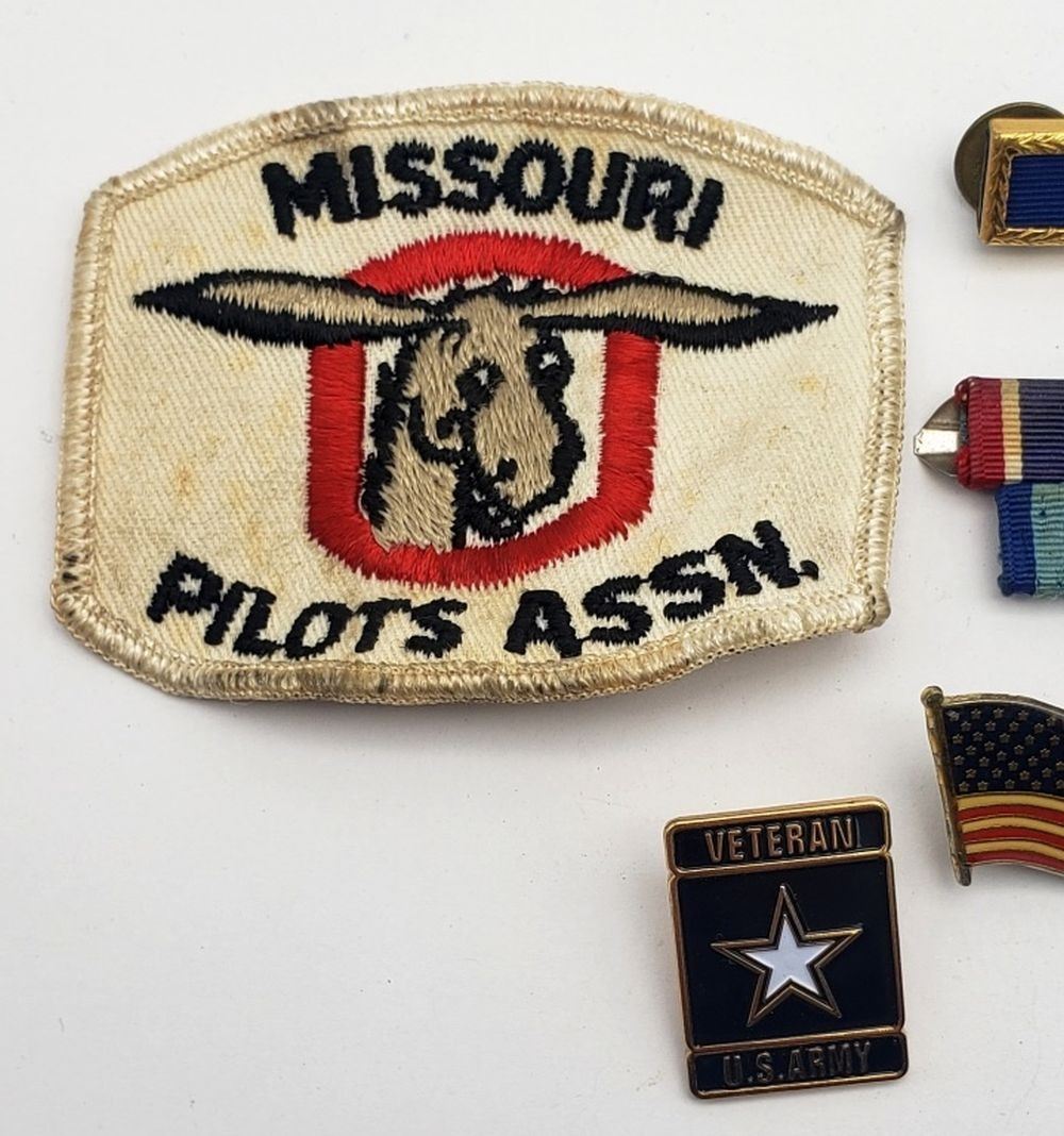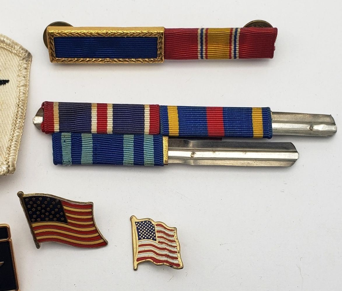 MILITARY AWARD BARS; 2-FLAG PINS; 1-U.S. ARMY VETERAN PIN