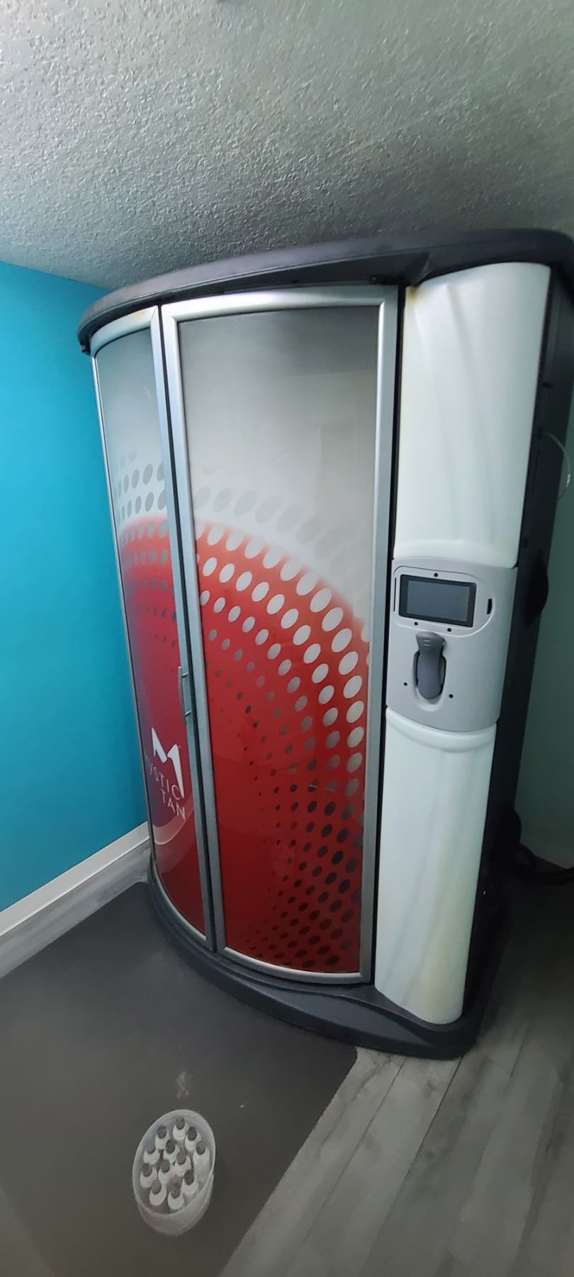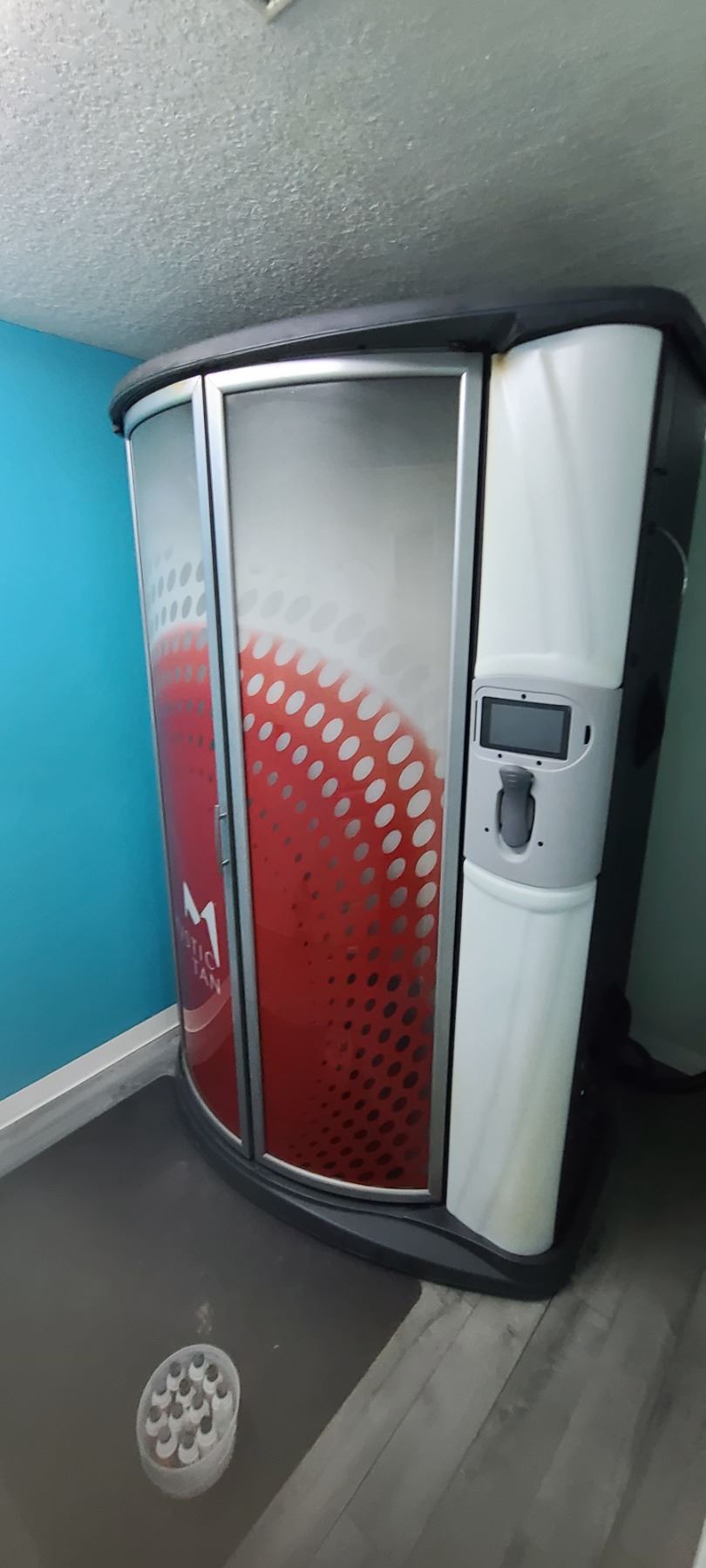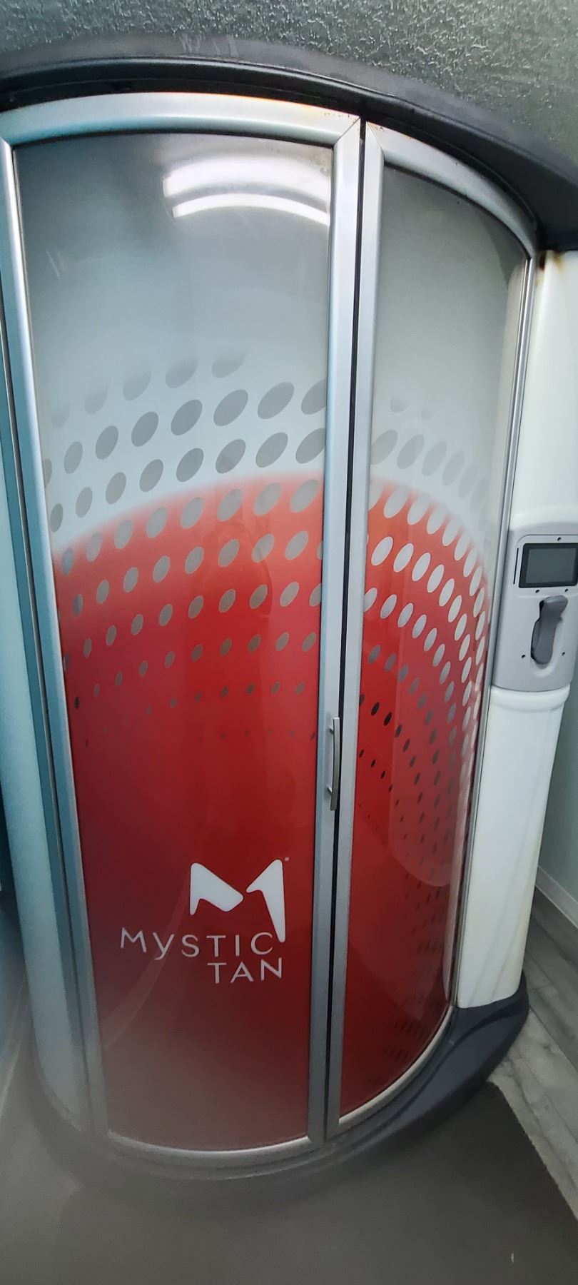 MISTIC TAN STAND UP SPRAY TANNING BOOTH - MODEL: MT6500 - COMES WITH THREE SPARE FILTER - HAS HEATING FEATURE FOR PUNTERS. COMES WITH SPARE HOSE AND 13 EXPIRED BOTTLES OF TSPRAY TAN. SIZE: 7'T X6'W X 4'T - BUYER MUST DISMATEL TO REMOVE