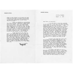<b>1169. MARGARET MITCHELL </b>(1900 - 1949)  American author, a Pulitzer Prize winner for her epic novel <i>Gone With the Wind</i>. Fine content T.L.S. "<i>Margaret</i>" on her personal letterhead, 2pp. 4to., Atlanta, Aug. 1, 1939 to her friend Herschel Brickell. In part: <i>"ÉI am feeling that an earache is preferable to sulfanilamide and the doctor crawling in and out of my ear with a lamp and pickaxe like a coal minerÉI tried but could not equal your dispositionÉ work piled up while I was under the weather and John and I have been laboring like coolies ever since...The approaching premier of `Gone With the Wind,' which has been promised to Atlanta, seems to have stirred up the public all over again and that makes for added difficulties. I feel certain that once the picture is over and done with things will be much better around our houseÉ</i>". Folds, else fine condition. Despite Mitchell's predictions, the December 15, 1939 premier of "Gone With the Wind" was one of the biggest, most heavily promoted film premiers ever, and of course Mitchell found little calm in her life once the film "took off"! <b>$2,000-3,000</b>