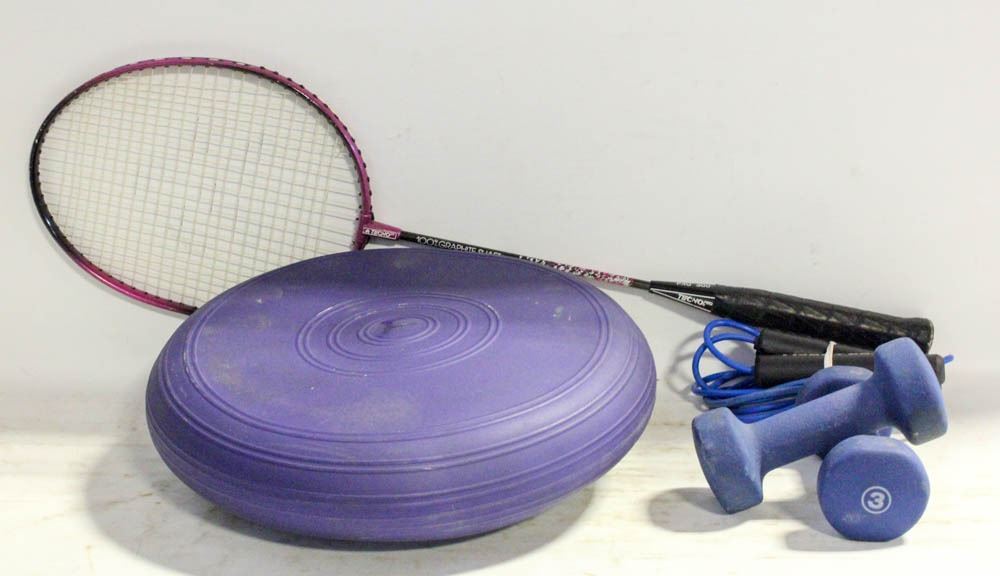 "EVERLAST" TWIST DISC, "FITTER FIRST" CORE WORKOUT DISC, 3 LB WEIGHTS (2), "CAPBARBELL" SKIPPING ROPE, BADMINTON RACQUET GRAPHITE SHAFT TECNO PRO