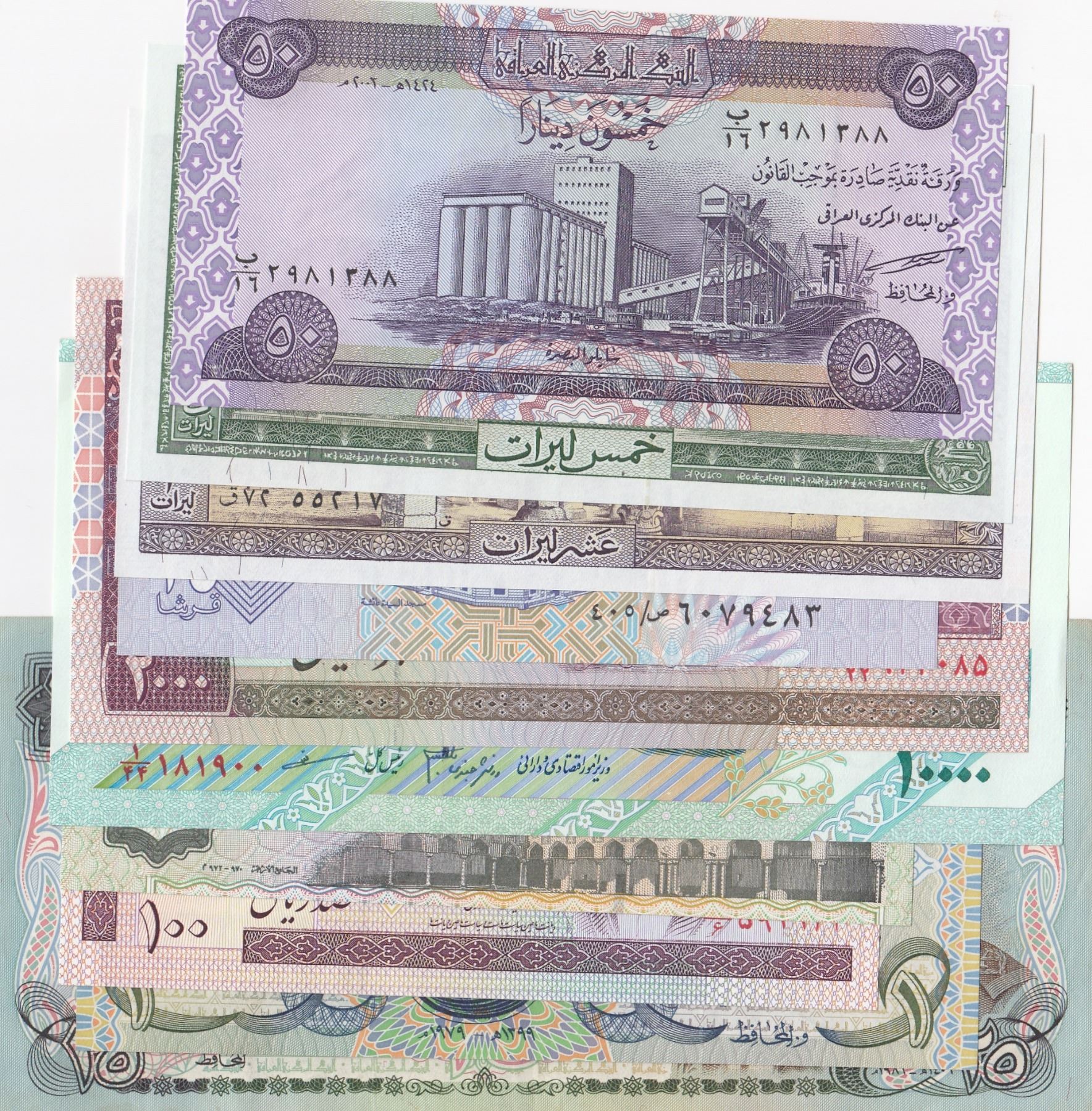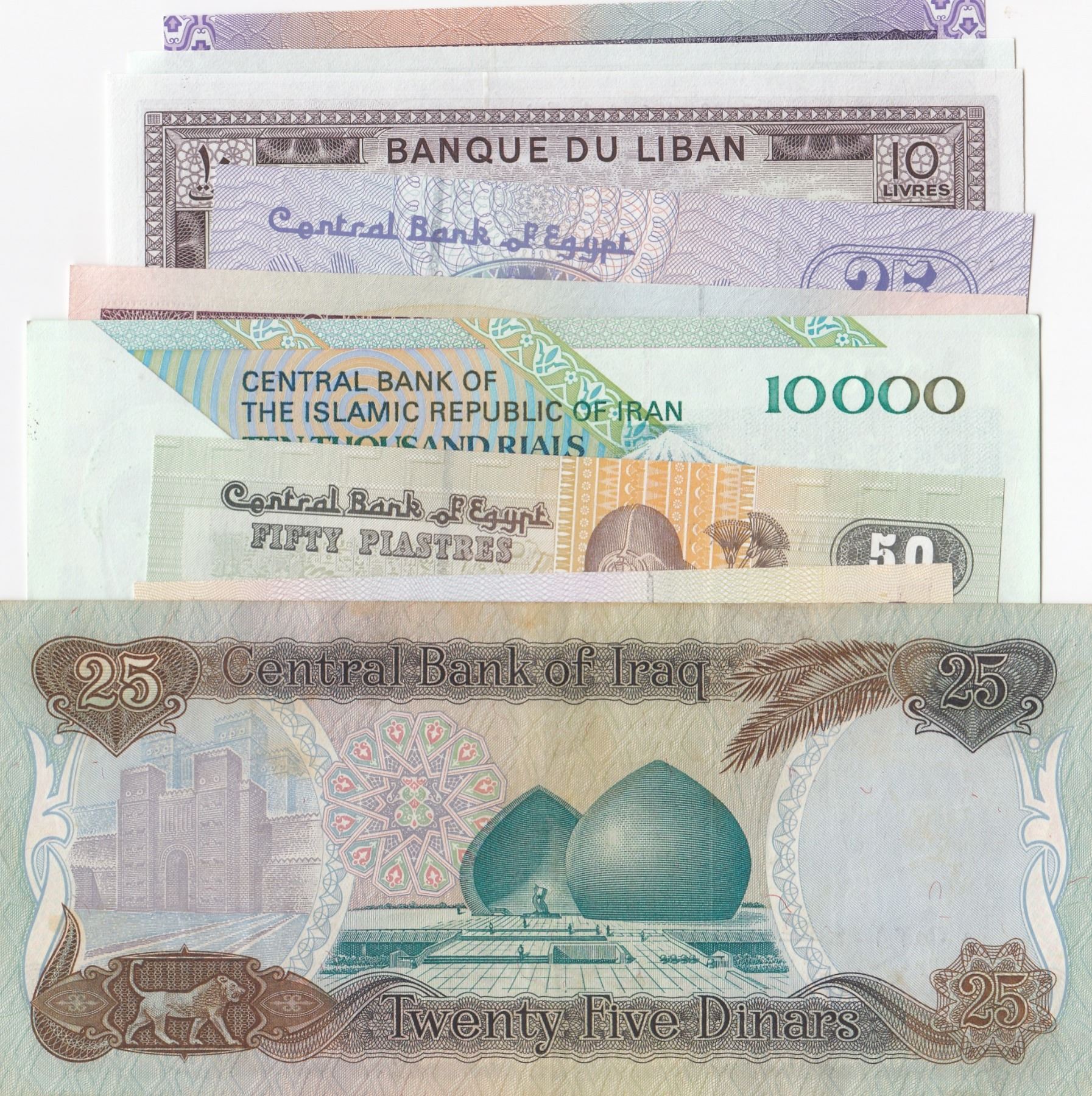 MIX LOT, Lebanon 10 Livres, Lebanon 5 Livres, Egypt 25 Piastres, Egyptr 50 Piastres, Iran 100 Rials, Iran 2000 Rials, Iran 10.000 Rials, Iraq 1 Dinar, Iraq 25 Dinar, Iraq 50 Dinar, (Total 10 banknotes)