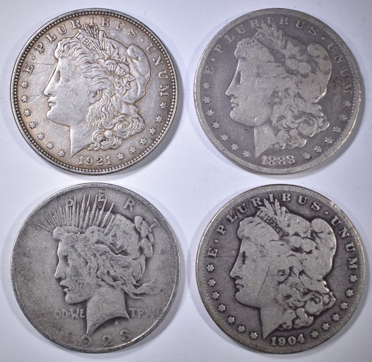 1904-S 1888-O & 1921 MORGAN, 1923-D PEACE DOLLAR ESTIMATE $100 - $120.