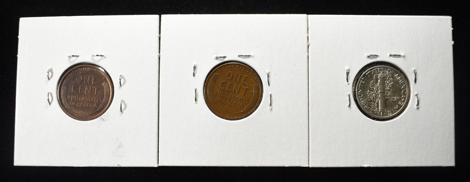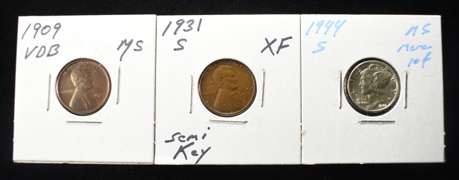 1909 VDB, 1931-S LINCOLN WHEAT CENTS & 1944-S MERCURY DIME ESTIMATE $160 - $210.