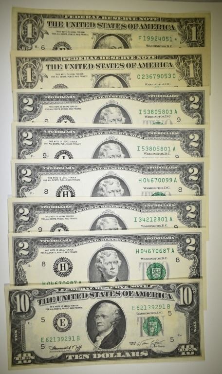 1988A $1 CU, 1995 $1 STAR AU, 1974 $10 AU, 5 2003 $2 GEM CU. ESTIMATE $75 - $100.