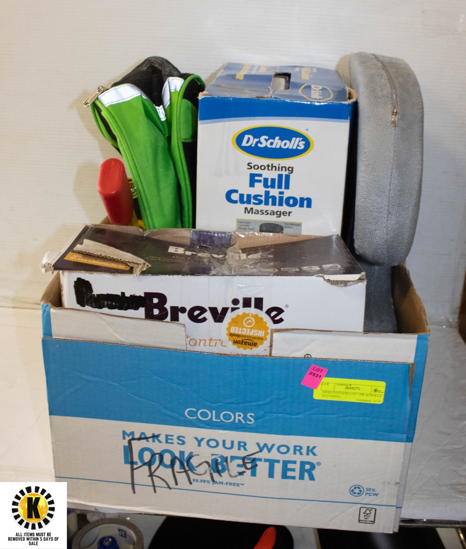 FULL CUSHION MASSAGE, BREVILLE CONTOUR GRIP, MEDIUM SIZED DOG CARRY KENNEL, HEAVY DUTY TIRE LOCK NO KEY, MEMORY FOAM SEAT CUSHION