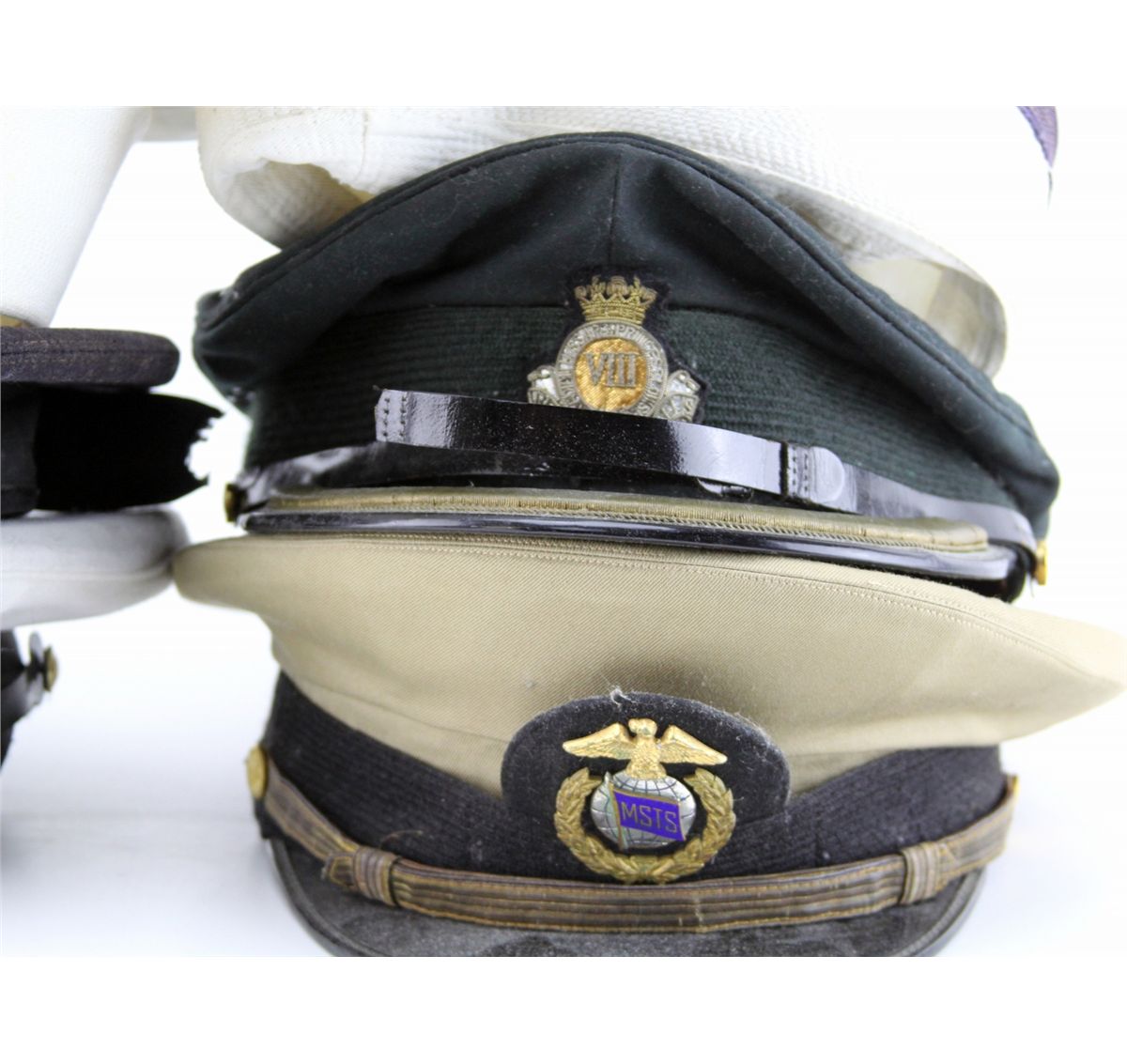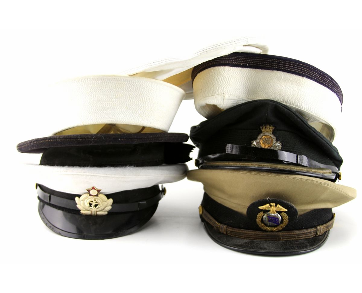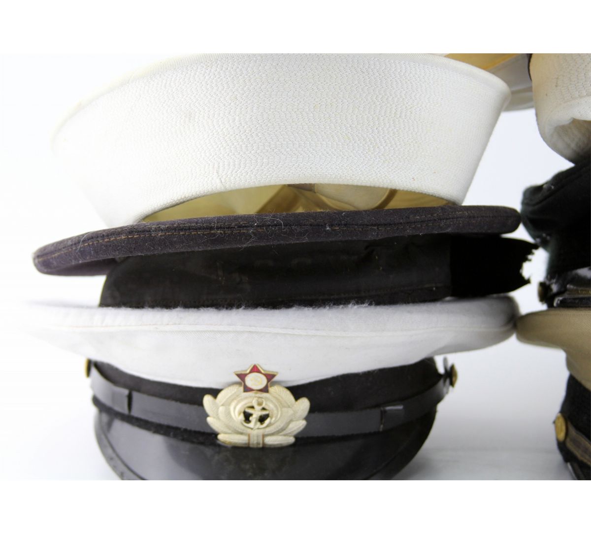 MIXED GROUPING OF VARIOUS MILITARY HATS Mixed grouping of various military hats, including Soviet navy cap Canada 8th Princess Louise officer's visor hat, sailor caps and more. 7 hats total. Country: Mixed Condition: Various, mostly good to better