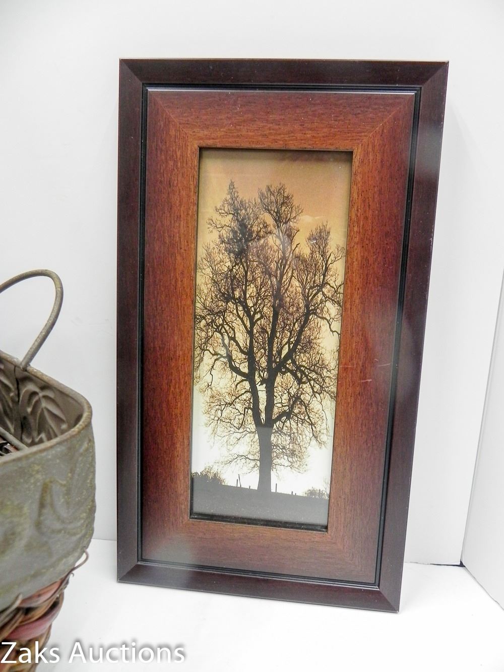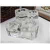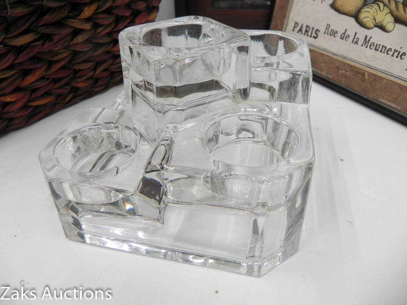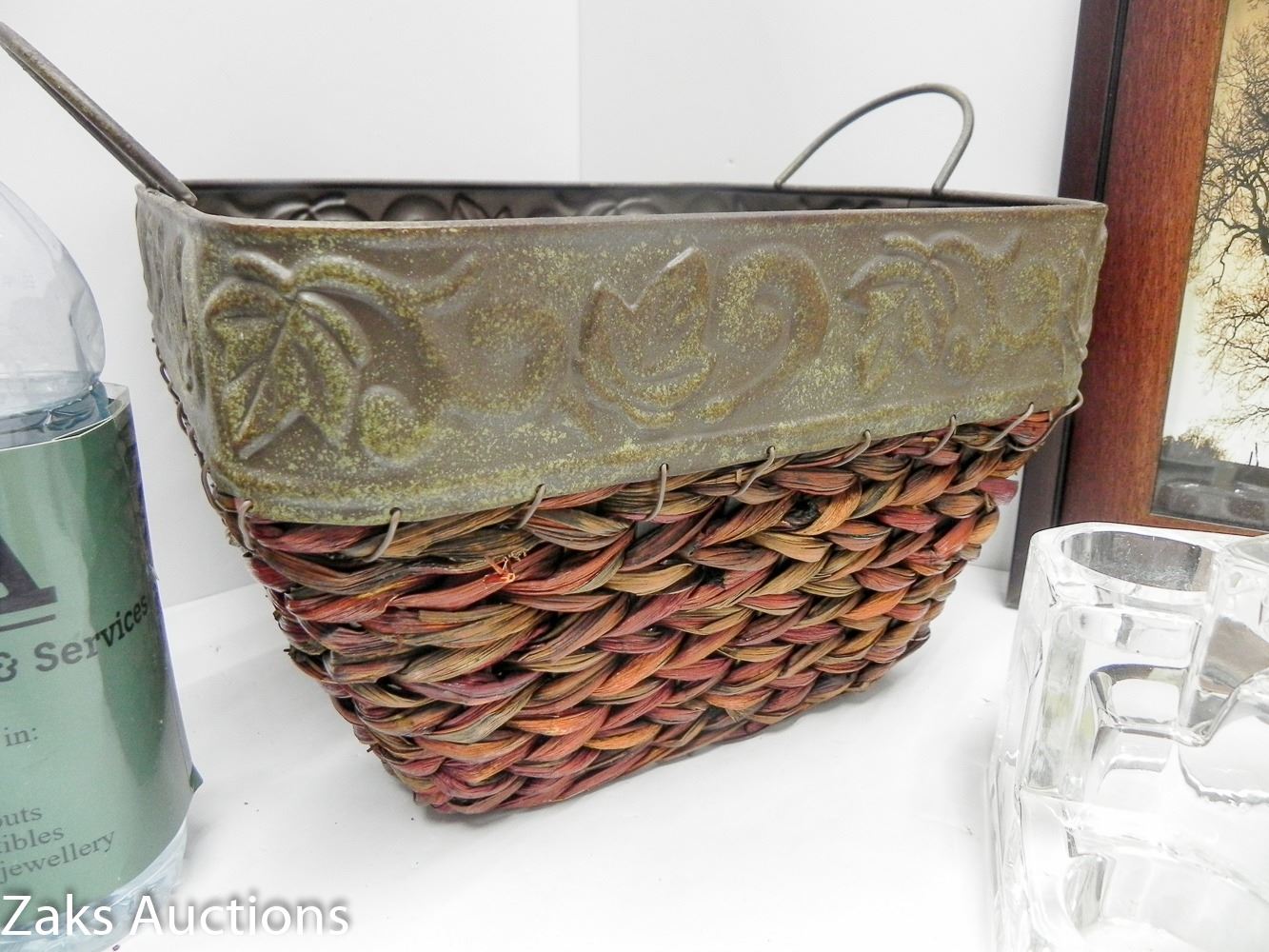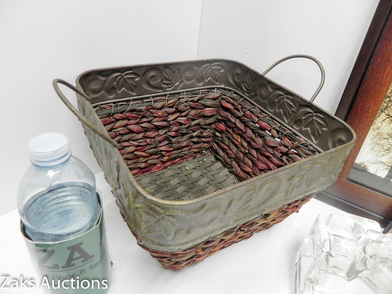 MIXED HOUSEWARE DECOR LOT. LARGE SQUARE BASKET, PARTYLITE ICE CANDLE HOLDER +