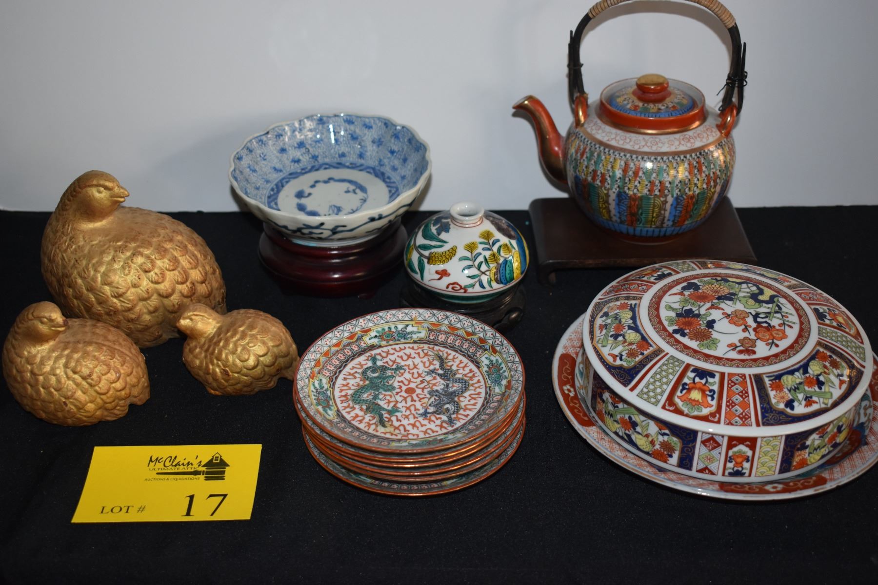 MIXED LOT: ANTIQUE BLUE & WHITE BOWL, ASSORTED PLATES, TEAPOT, VASE & BIRDS (14 PCS)